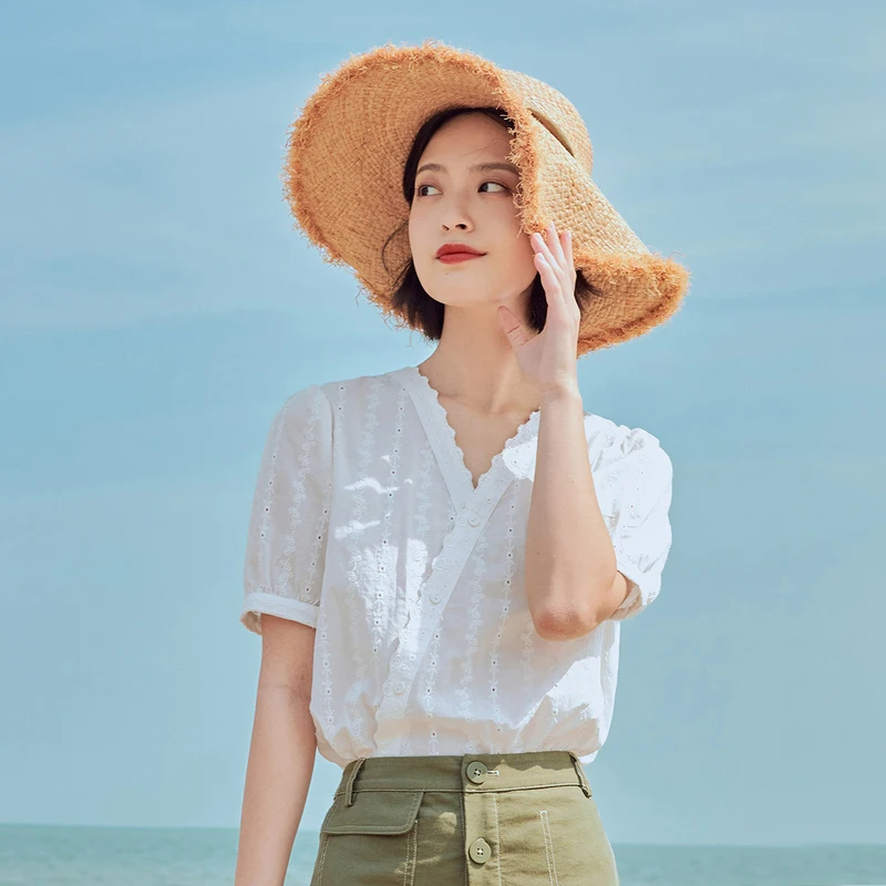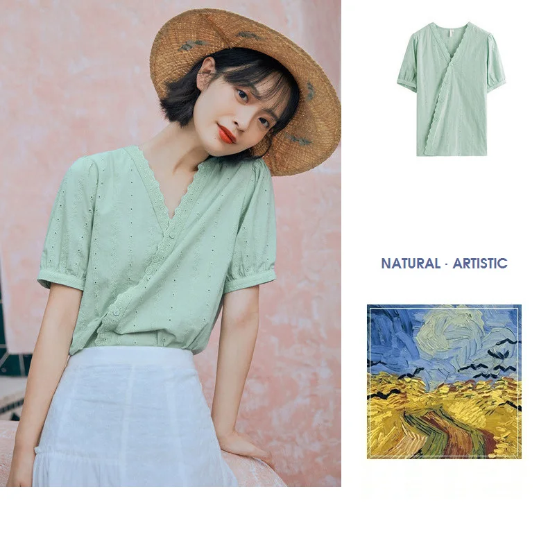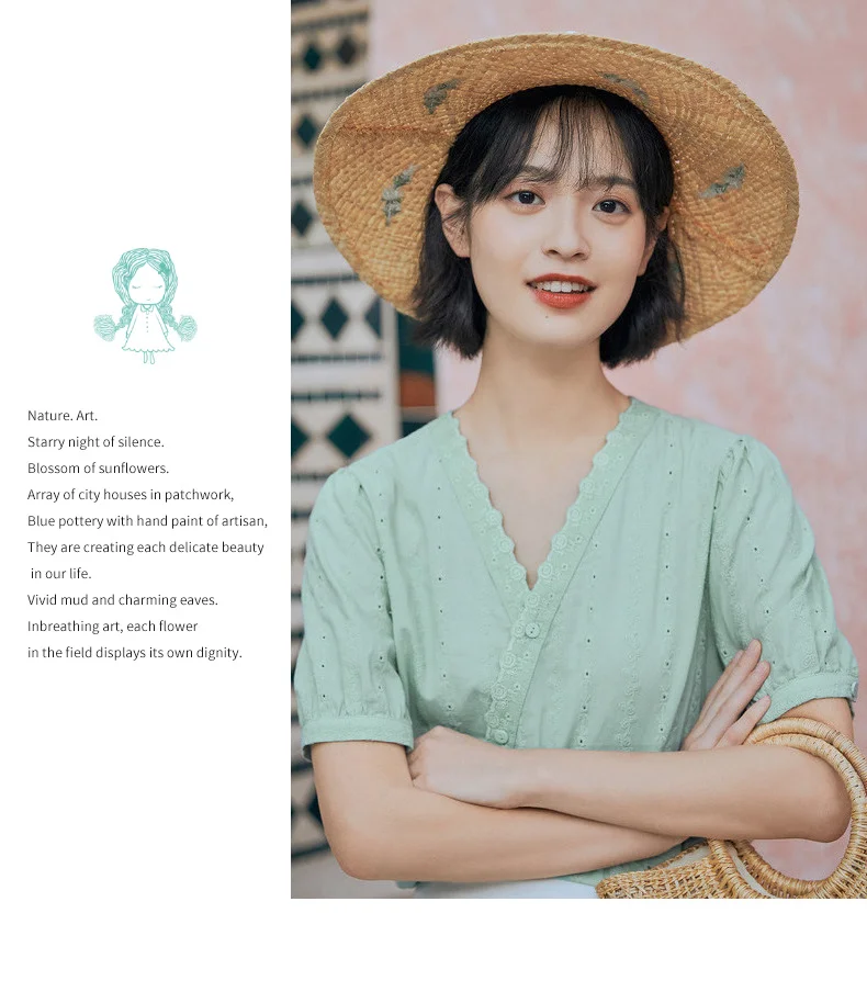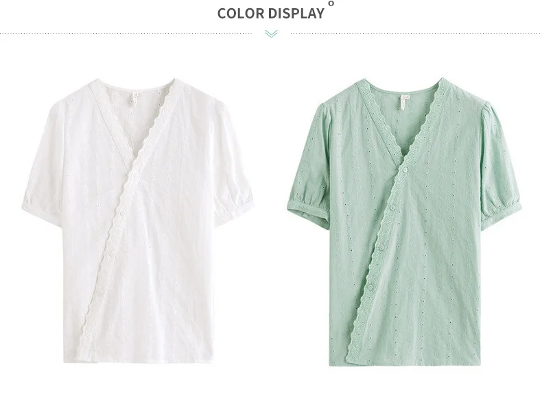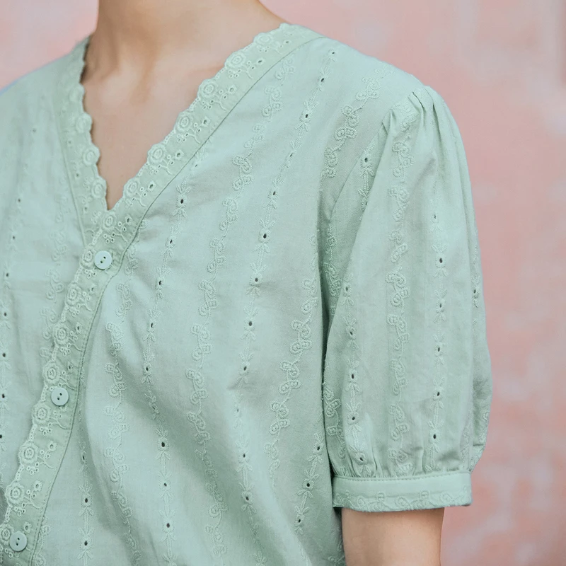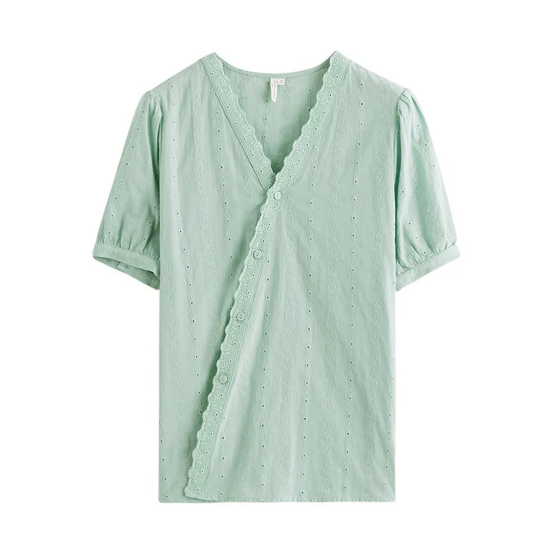 Женская рубашка с коротким рукавом, V-образным вырезом и вышивкой