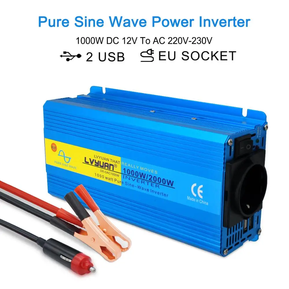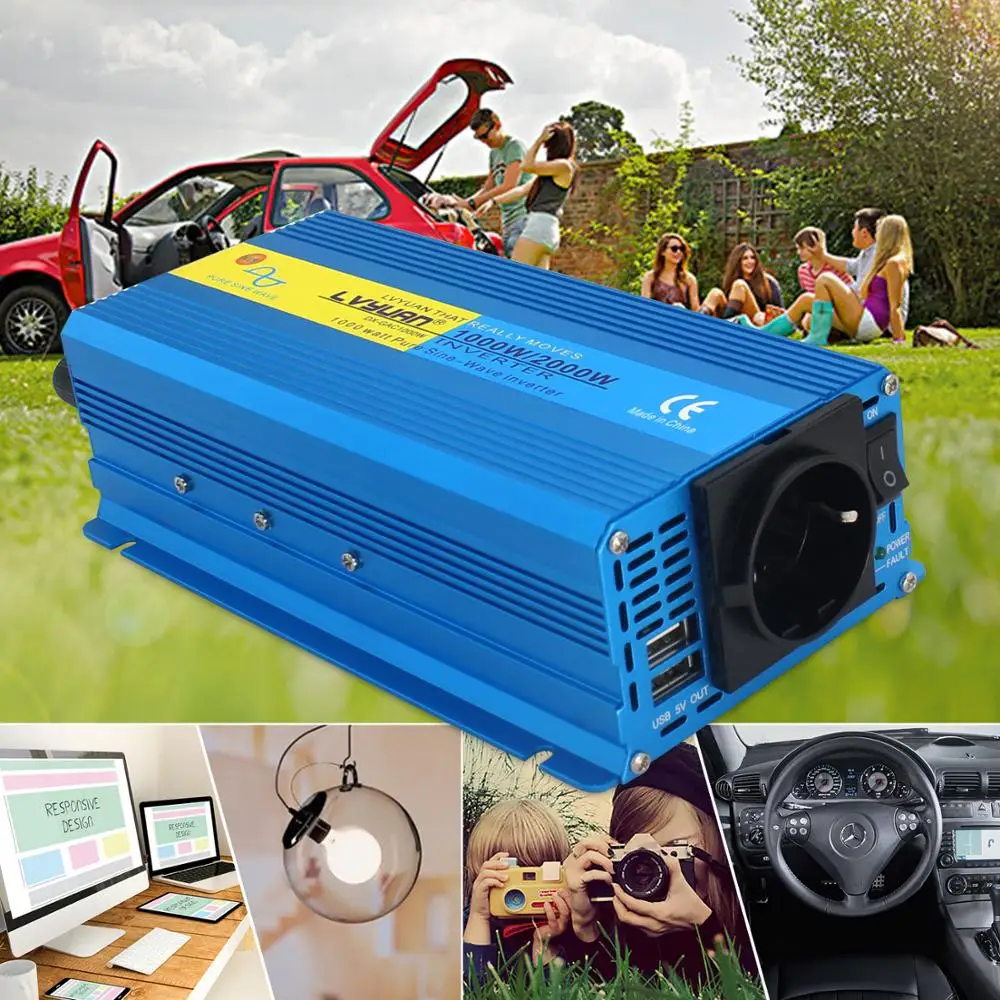 Инвертирующий усилитель напряжения, 2000 Вт, немодулированный синусоидальный сигнал, трансформатор напряжения для автомобиля, кемпинга, 230 а, с 2 USB-портами и европейской вилкой, 12 В постоянного тока на В переменного тока, голубой