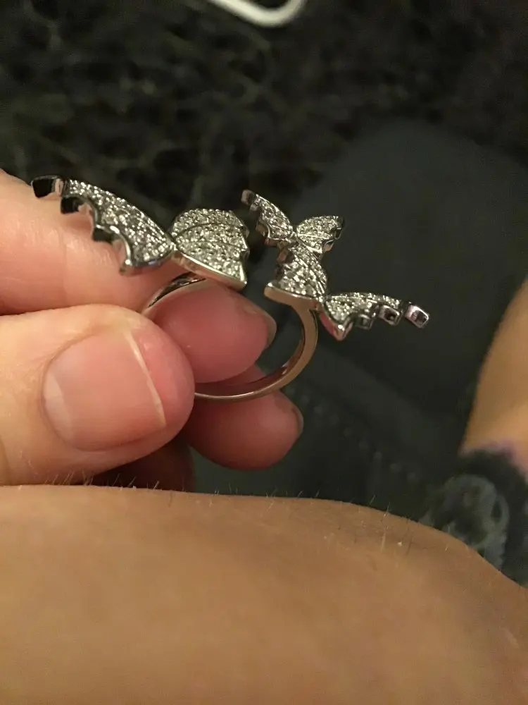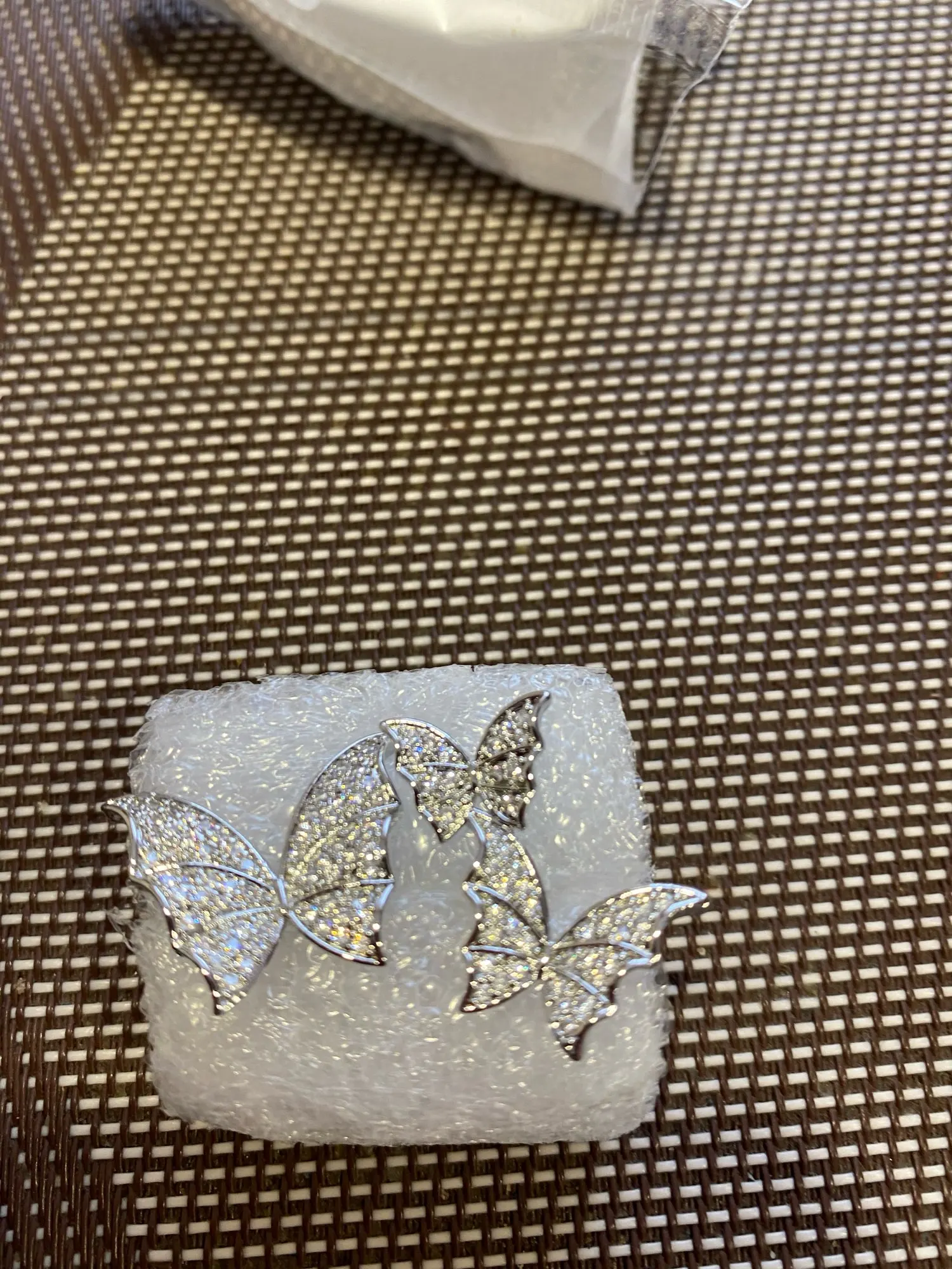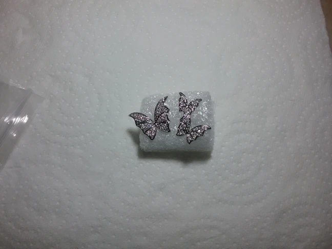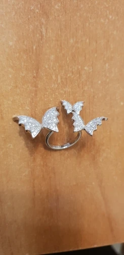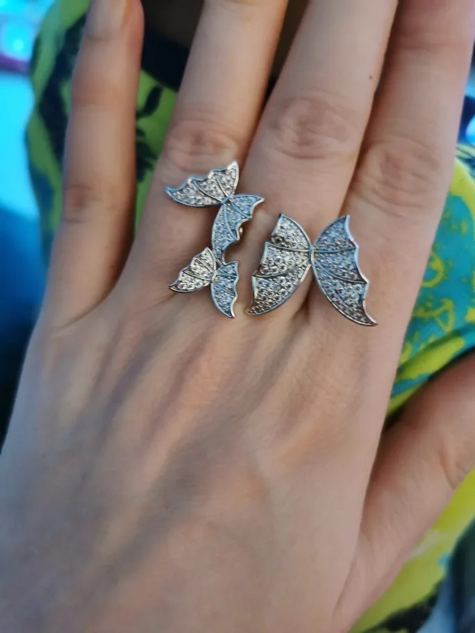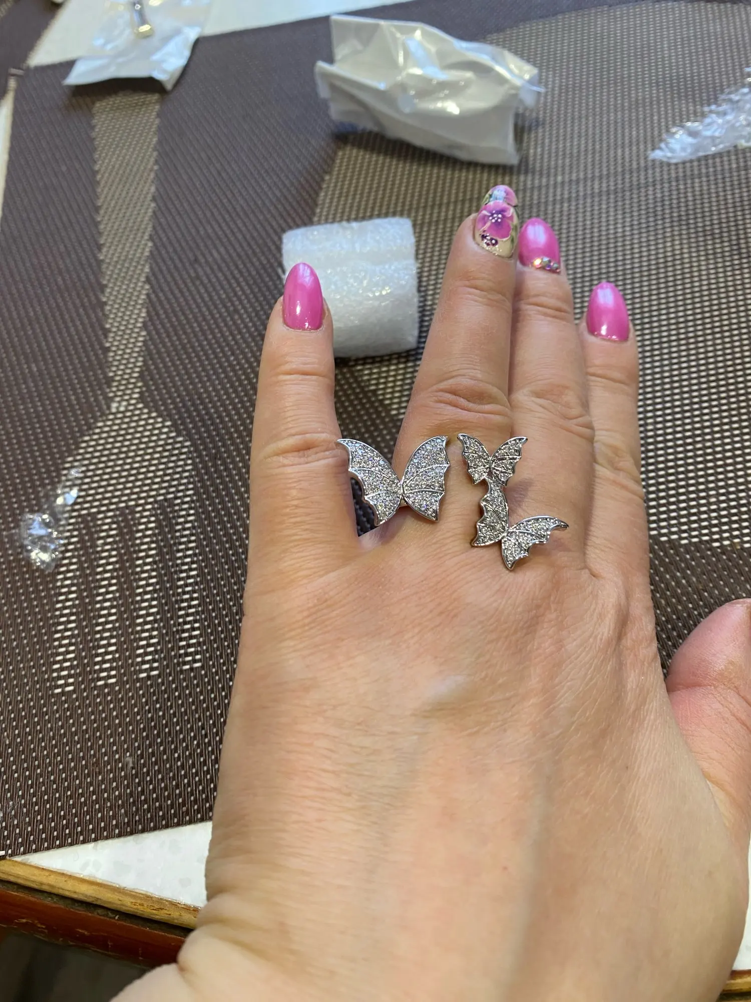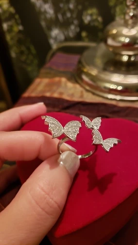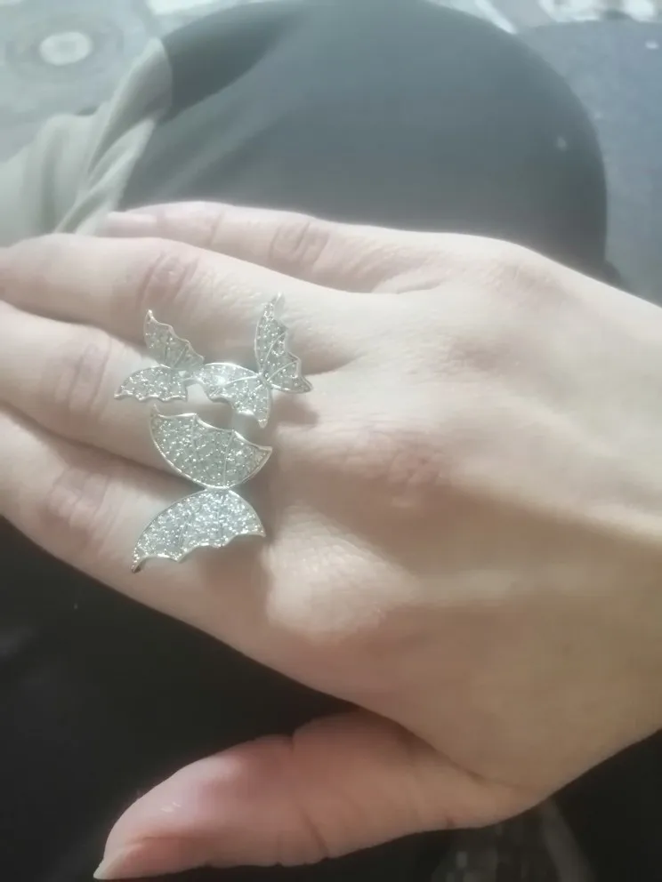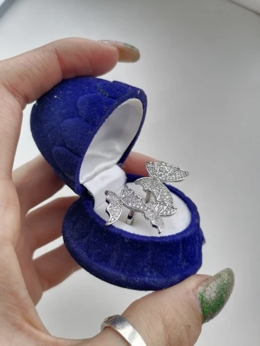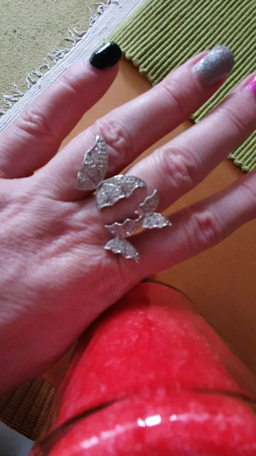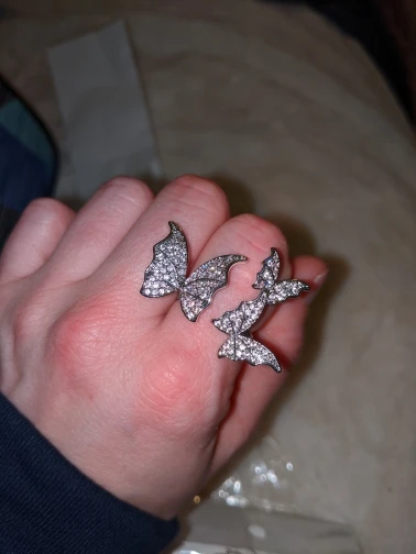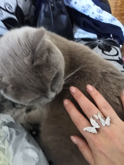 Товар получила быстро. Но кольцо немного отличается от картинки. Да, оно переливается, но "прожилки" не чёрные, как на картинке, а белые. Достала кольцо аккуратно, а маленькие бабочки уже шатались.... Второй раз мерию, а бабочки отвалились. Открывать спор не буду. Попрошу мужа, он мне их "сварит".