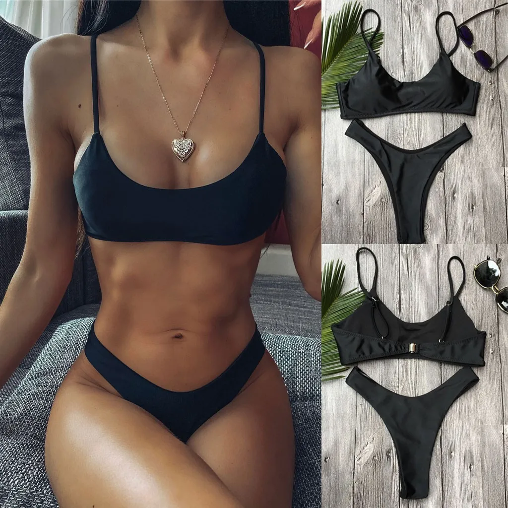 Черные женские бикини, модные высококачественные женские купальники, одноцветные бикини с ремешками, два предмета, сексуальный женский летний купальник