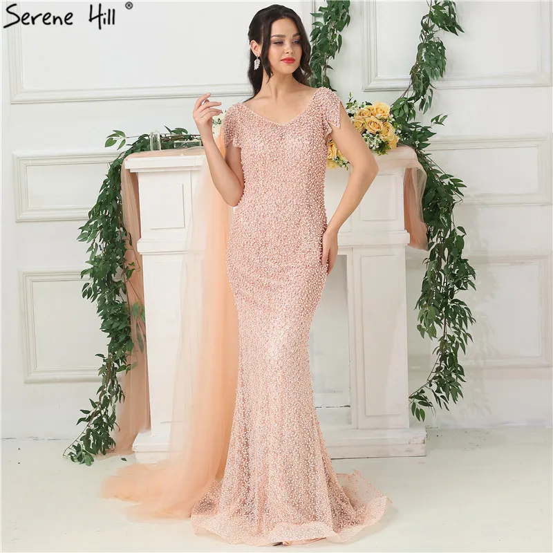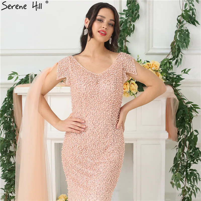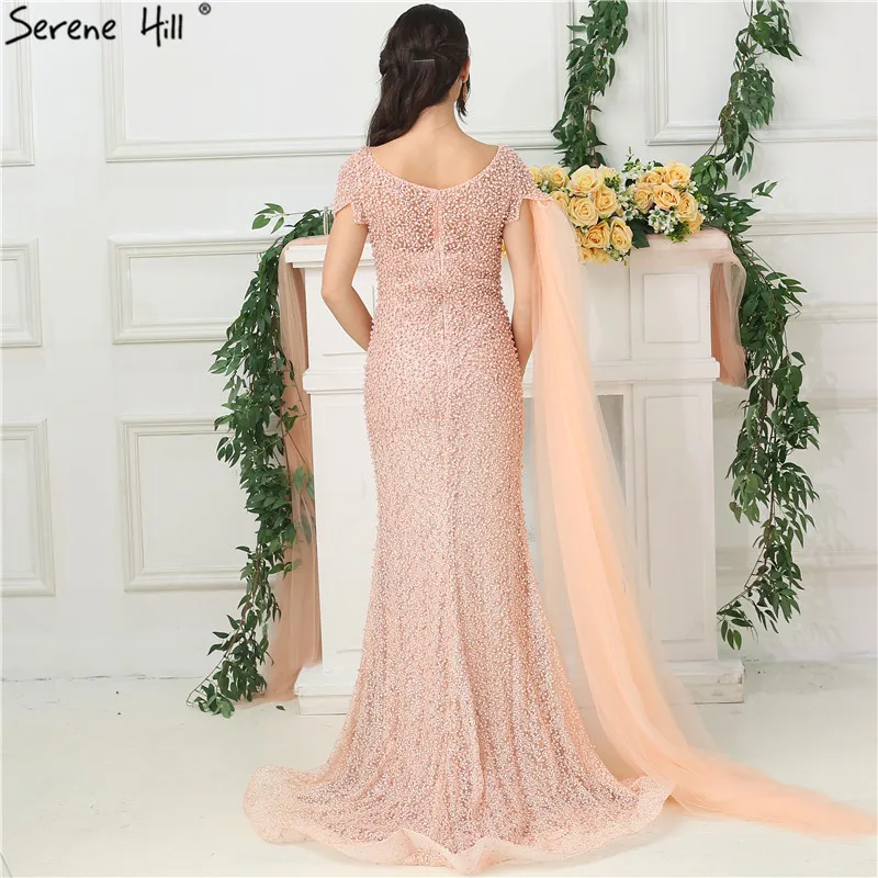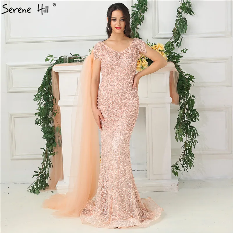 Дубай o-образным вырезом жемчужное Русалка Вечерние платья 2021 Персиковое с коротким рукавом сексуальное формальное платье Serene Hill LA6642