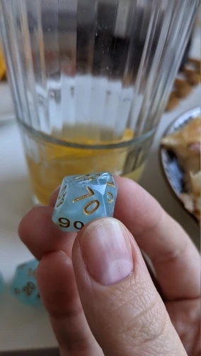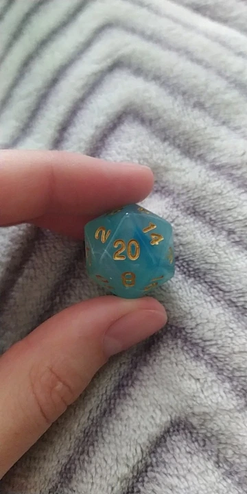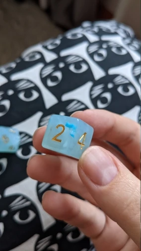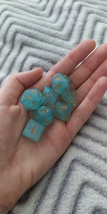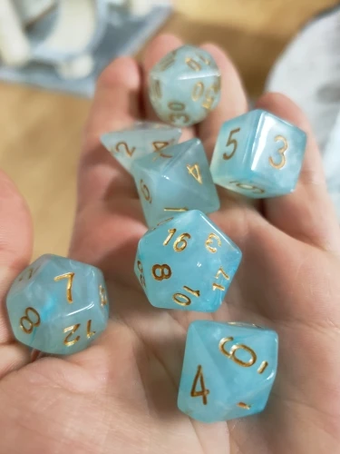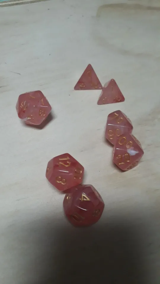 дайсы очень замечательные, крайне красивые, цвет как раз как на фото. цифры очень четкие и хорошо прокрашены, приятно в руках держать! есть некоторые косяки вроде срезанной грани на д10, или крупных капель краски в разводах, но я даже заезду снимать не стану, настолько этот сет красивый и обаятельный! спасибо продавцу, очень дёшево.