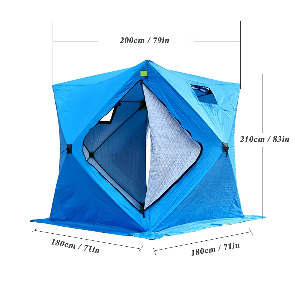 Ветрозащитный и непромокаемый укрытие, простая установка и защита от сильного ветра и холода. Просторный, подходит для 3-4 человек, отлично подходит для подледной рыбалки с друзьями. Особенности: Все помещается в сумку для переноски, которую можно легко носить с собой на спине. 60-секундная установка, быстро и легко. Вместимость 3-4 человек с размером установки 71 "* 79" и 83 "высотой. Сетчатые карманы для хранения необходимых рыболовных снастей. Съемные окна регулируют вентиляцию вашего убежища с помощью съемных крепежных окон. Чрезвычайно прочная ткань 300D блокирует ветер! Спецификация:Материал палатки: 300DМатериал полюса: стекловолокноДиаметр столба. : 9,5 ммЦвет: синий/оранжевый (необязательно)Вес изделия: около 10 кг/22 фунтаРазмер установки: 180*200*210 см/71*79*83 дюймаВнутренний размер: 180*180*200 см/71*71*79 дюймовПосылка: 12 кг/26 фунтов Посылка тация:1 * палатка4 * колышка4 * веревка1 * сумка для хранения