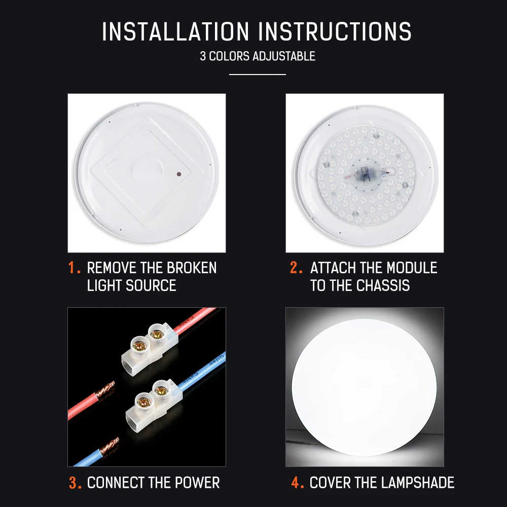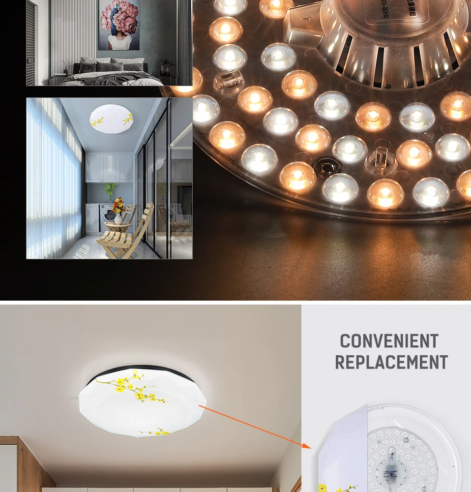 Название: светодиодный потолочный светильник (простая установка) Тип изделия: светодиодный модуль 24 Вт/36 Вт Источник питания: 220 В переменного тока Напряжение: AC220V Световой поток 80 лм-100 лм/Вт Стиль: современный Цвет излучения: белый светильник/теплый белый/двухцветный Мощность: 24 Вт/36 Вт Цвет: холодный белый (6000-7000K), теплый белый, с регулируемой яркостью Угол луча (°): 150 Срок службы: >50000 часов Использование: Ежедневный светильник, гостиная/спальня/крытый светильник освещения ing