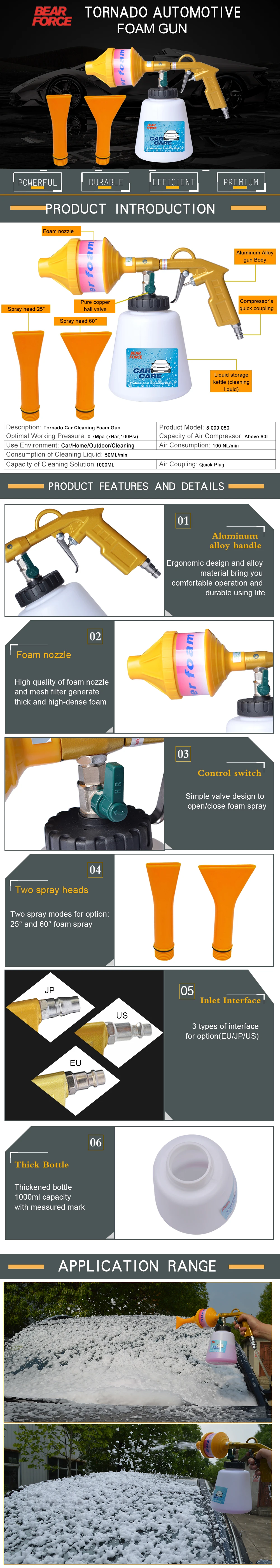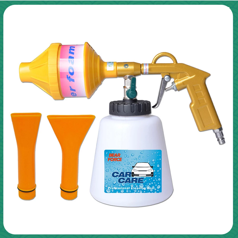 Поролоновый пистолет соединен с воздушным компрессором, который генерирует pОбильная, толстая и высокоплотная пена из моющего средства для автомобиля.