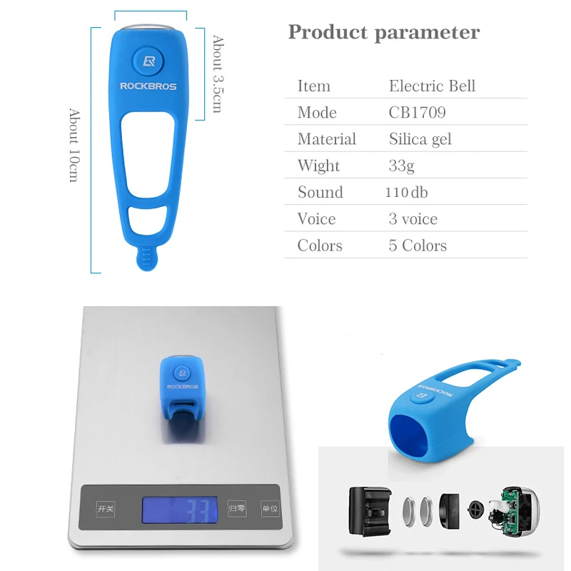 Бренд: RockbrosВес: около 33 гРазмеры: около 3,5 см * 3 смМатериал: силикагельДецибел (дБ): около 110 дБГолос: 3 голоса на выборЦвет: черный/зеленый/красный/синийПримечание: Теперь мы обновили электронный звонок, улучшили до 110 дБ звук, более громкий и безопасный.Виоки отличаются от традиционных колокольчиков.
