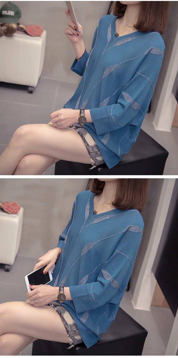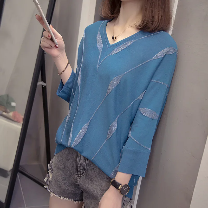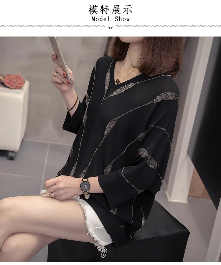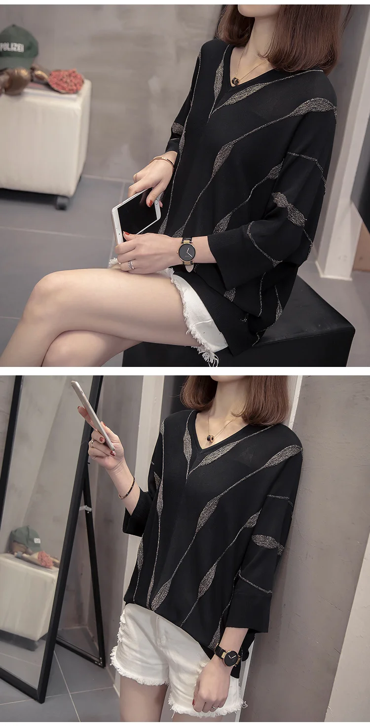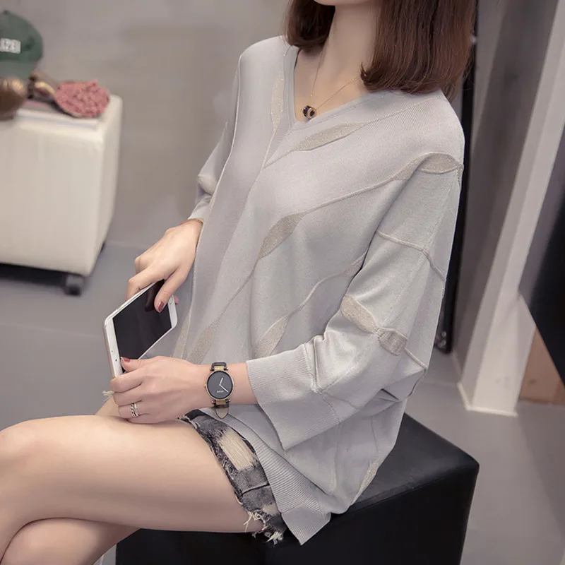 Женский вязаный Свитер оверсайз с V-образным вырезом, свободный серебристый полосатый джемпер с рукавами летучая мышь в Корейском стиле, весна-лето 2021
