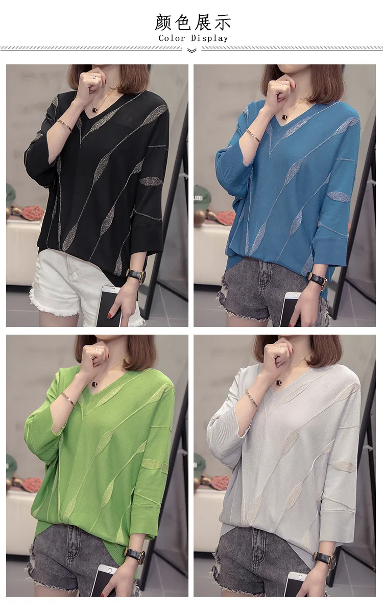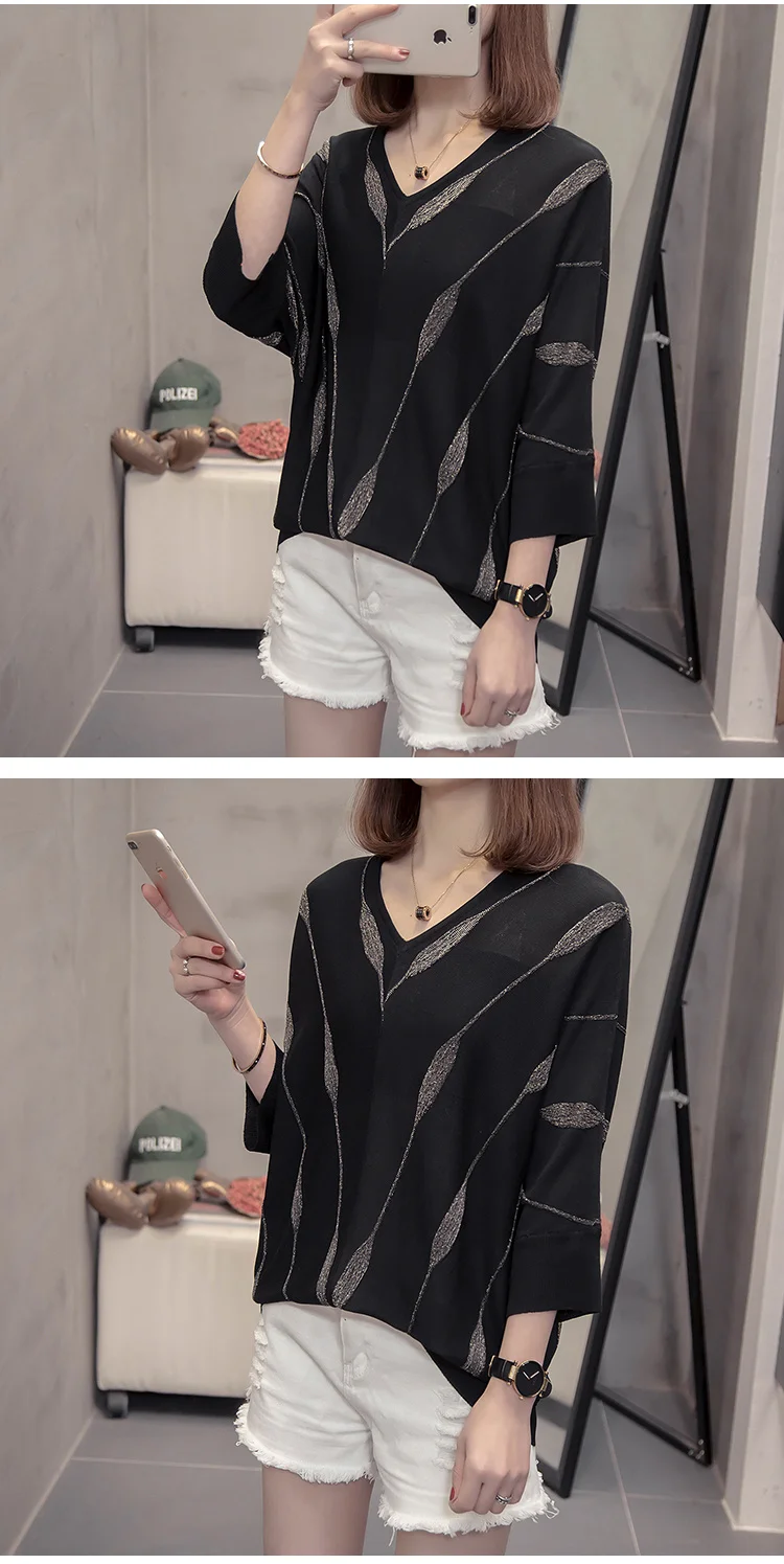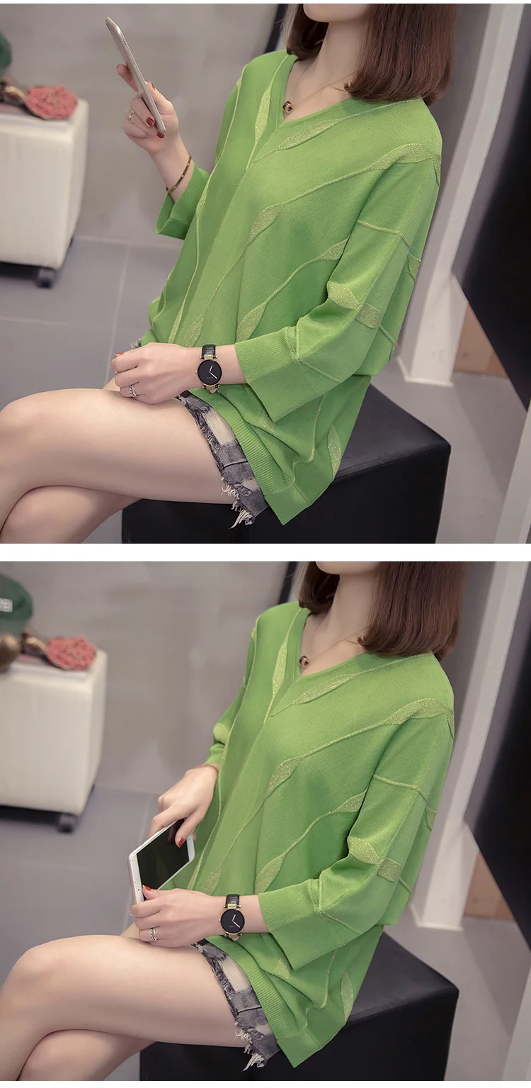 Женский вязаный Свитер оверсайз с V-образным вырезом, свободный серебристый полосатый джемпер с рукавами летучая мышь в Корейском стиле, весна-лето 2021