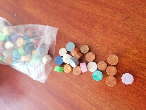I got a little plastic bag whit wax beads. How many beads there are, i can not tell you. They have melted together! Can not use any of them!