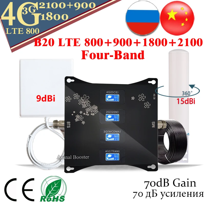 Российский диапазон 20)LTE800 900 1800 2100 четырехдиапазонный мобильный усилитель сигнала LTE GSM WCDMA UMTS 4G Сотовый усилитель 2g 3g 4g ретранслятор сигнала Особенность:1. Высокое Усиление: 70 дб. Покрытие: 550 квадратных метров без барьеров2. Одновременное улучшение 4g lte 800 2G GSM 900mhz, 3G UMTS WCDMA 2100mhz,4G DCS LTE 1800mhz.3. Поддержка одновременного использования более 25-30 сотовых телефонов4. Уменьшите мощность передачи мобильного телефона5. Легко установить. Эта ссылка-усилитель и источник питания.6. ЖК-дисплей и светодиодная сигнальная лампа указывают на состояние сигнала.7. Подходит для: России, Испании, Франции, Бразилии, Европы, Азии и т. д. 8. Гарантия: 1 год![Лучший голос и передача данных] Получайте меньше сброшенных вызовов, лучшее качество голоса, более быструю загрузку и загрузку. Вы можете поделиться, что наслаждаетесь временем через хороший голосовой вызов, и вы не беспокоитесь о том, что звонок внезапно отключится.