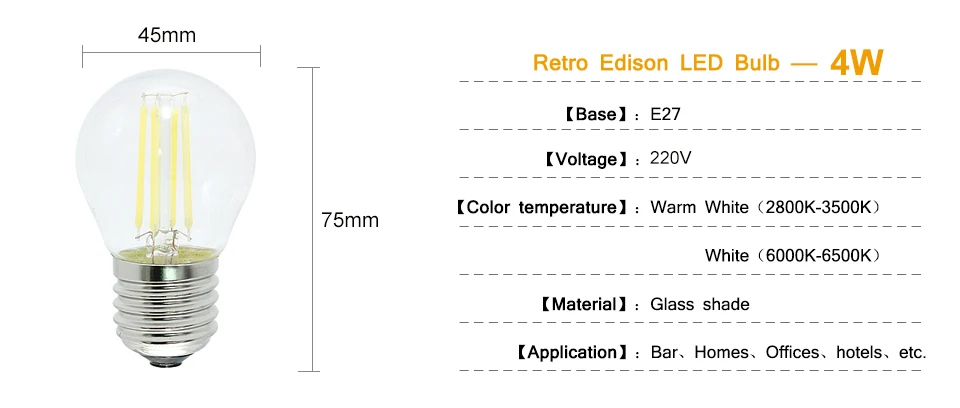 Название: Ретро Светодиодная лампа накаливания Тип цоколя: E27 Модель: G45 Мощность: 2 Вт/4 Вт/6 Вт Количество СВЕТОДИОДНЫЙ Дов: 2 шт/4 шт/6 шт Цветовая температура: теплый белый 2700-3200K; Холодный белый: 6000-6500K Люмен: 100 лм/Вт Напряжение: 220 В CRI: 90Ra (подходит для витрин и украшения пятизвездочных отелей) Угол свечения: 360 ° Рабочая температура: от-20 ° до + 40 ° Рабочая влажность: 20%-85% относительной влажности без конденсации Температура установки: от-20 ° до + 70 ° Влажность при хранении: 10%-95% относительной влажности Материал: стекло Средний срок службы:> 80000 часов Гарантия: 3 года Сертификат: ROHS и CE