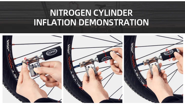 1. Подключите воздушное сопло и поверните его до тех пор, пока оно не затянется (нажмите на сопло непосредственно) 2. Проверните защелку на бутылка с азотом жля надувания. 3. Затяните газовый баллон после надувания, демонтируйте газовое сопло и завершите надувание.