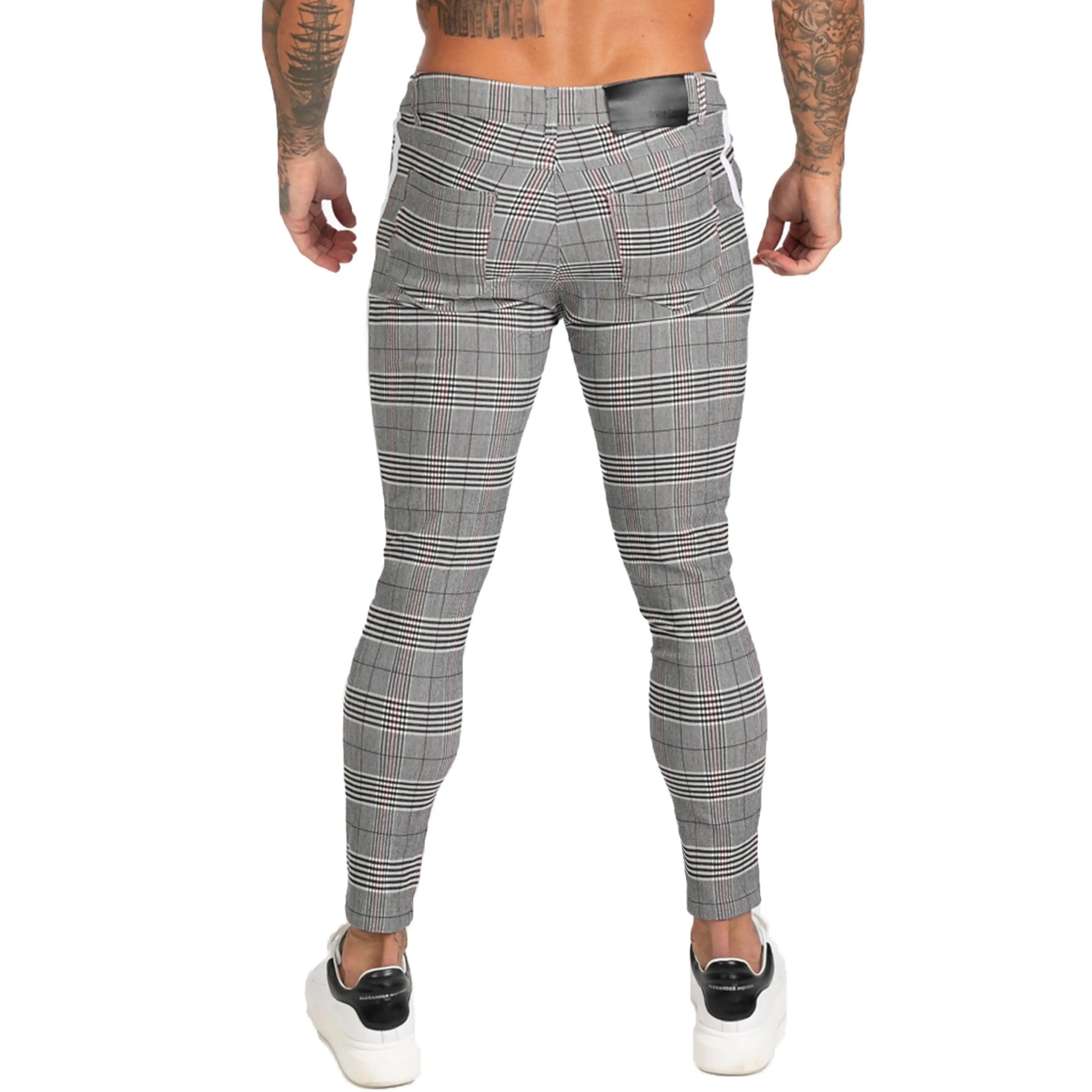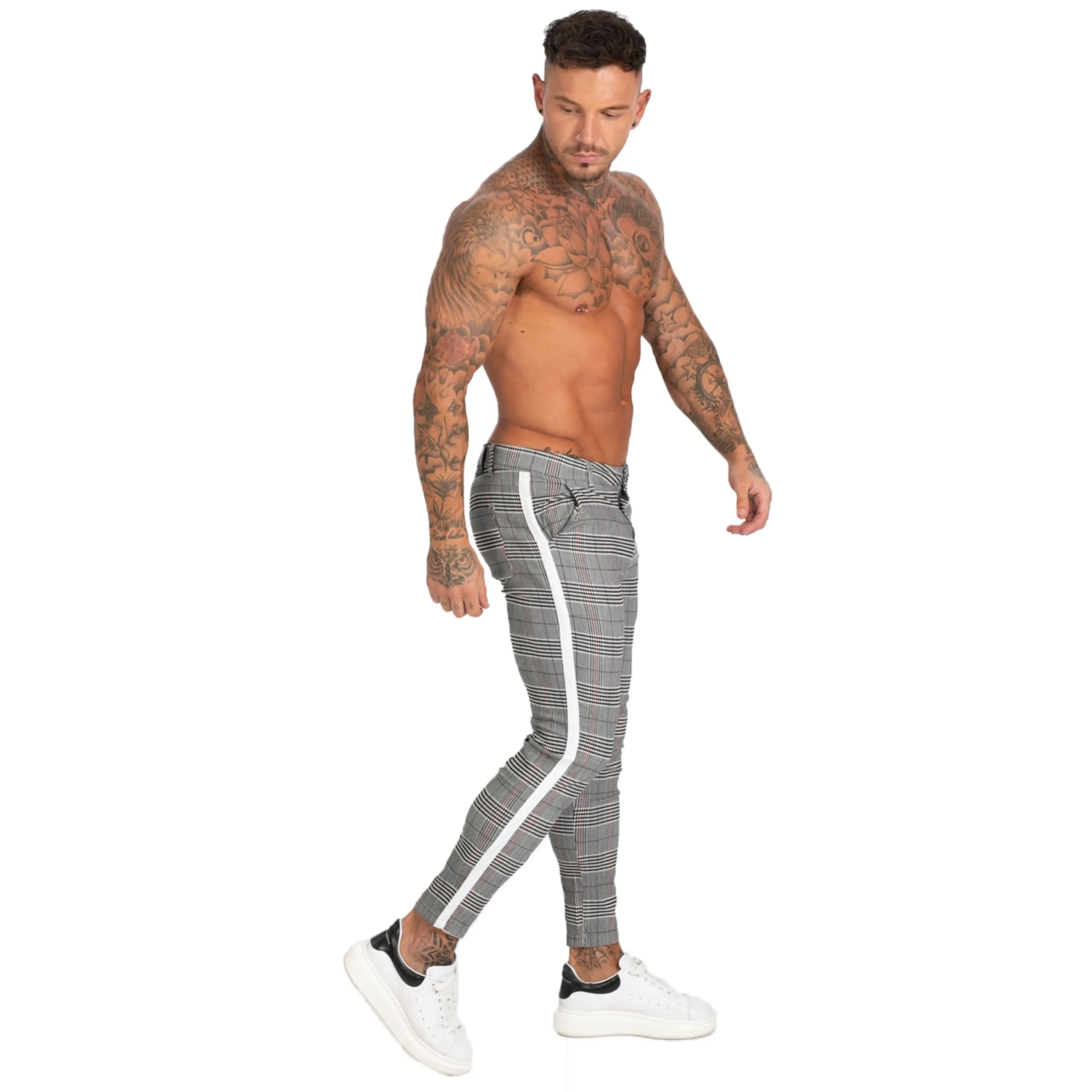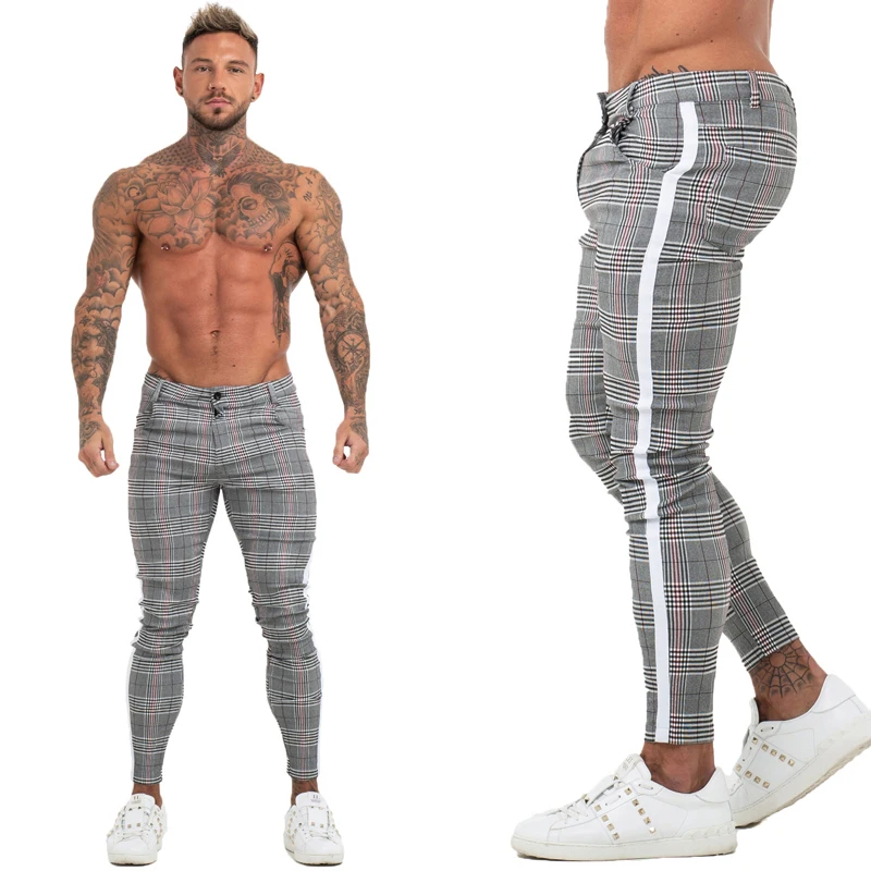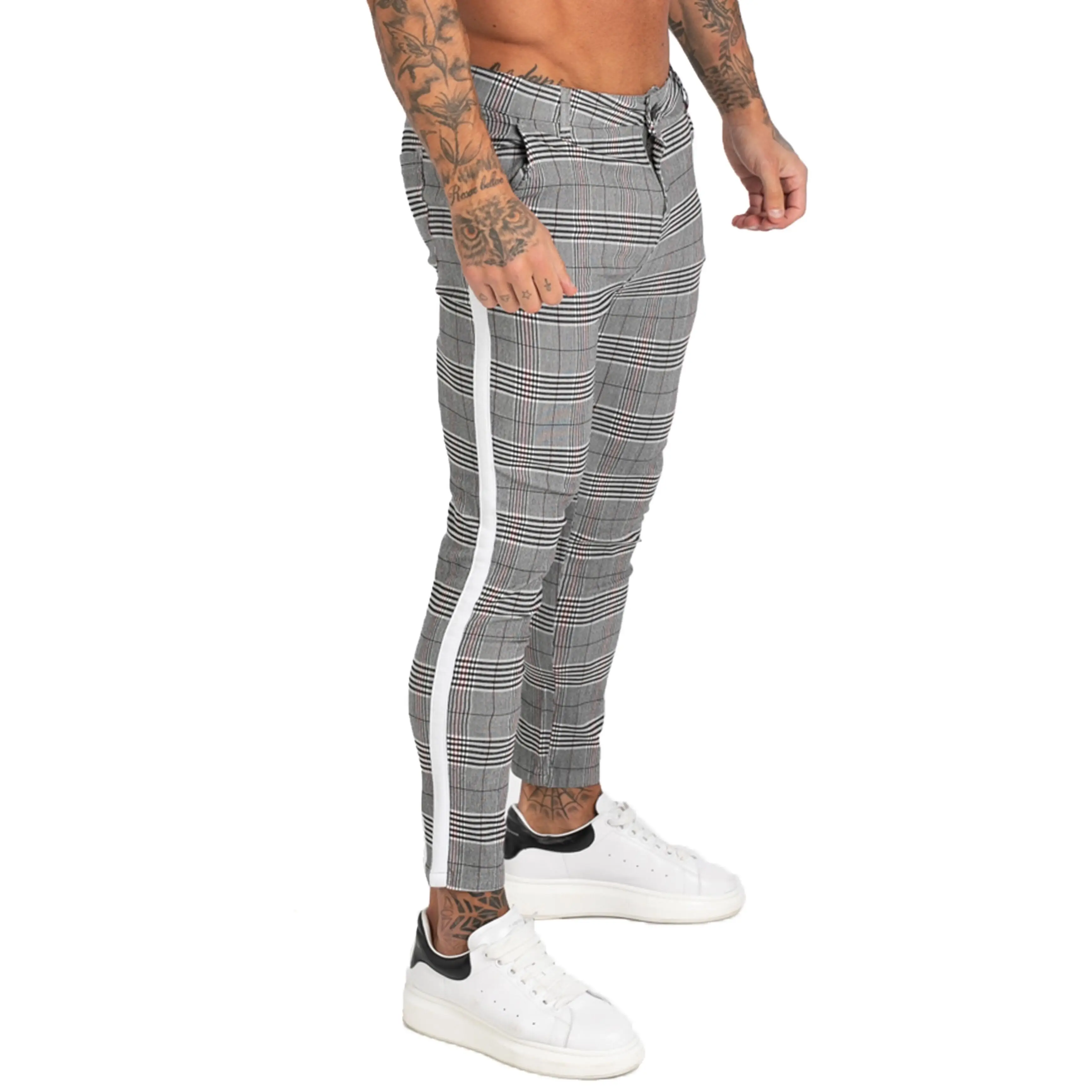 Джинсы мужские узкие в шотландскую клетку, с полосками сбоку