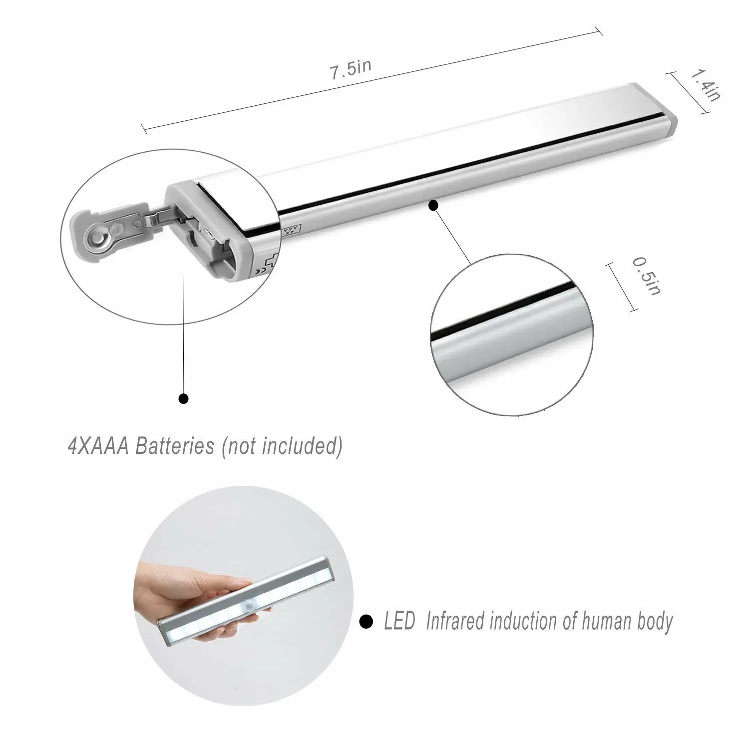 -Датчик движения и ночи: с пассивной инфракрасной технологией, он может быть обнаружен движением человека в темноте. Автоматическое включение в пределах 10 футов, автоматическое выключение через 25-30 секунд без обнаружения движения. -Отличный светильник: с 10 светодиодный в каждом светильник, который может светильник с хорошим количеством светильник. Не как лампа для чтения, но достаточно, чтобы видеть вокруг вашей комнаты без проблем. -Питание от аккумулятора: экономия времени на вытягивании и зарядке, требуется 4 батарейки AAA (не входят в комплект), которые будут доступны в течение длительного рабочего времени. -Простота установки: с магнитной полосой, без инструментов, винтов или гаек. Приклейте в любом месте. Идеально подходит для лестниц, кладовки, шкафа в ванной комнате, подвала и т. д.