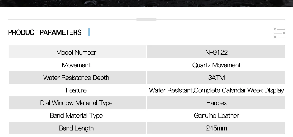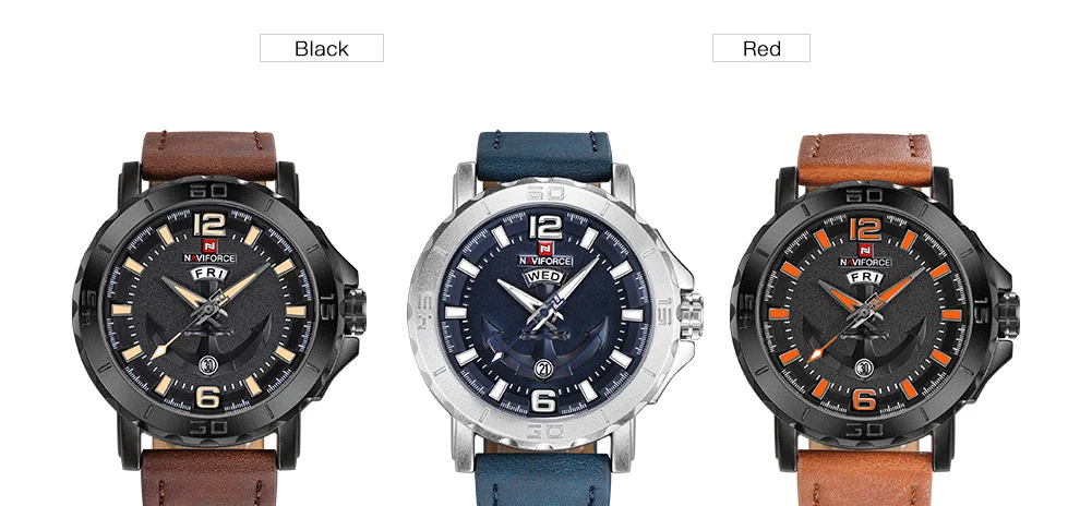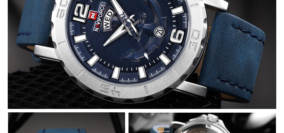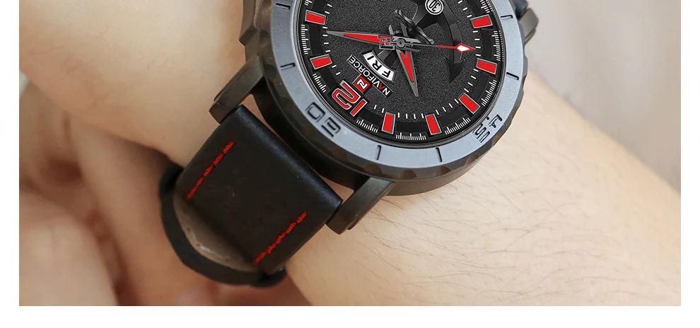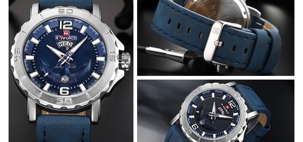 Модель: NAVIFORCE NF9122Механизм: кварцевый механизмМужские и мужские Пол: Relogio MasculinoСтиль: Модный, Повседневный, СпортивныйМатериал циферблата: стеклоМатериал ремешка: кожаТип застежки: ПряжкаДиаметр циферблата: 46 ммЧехол Толщина: 13 ммДлина ремешка: 245 ммШирина ремешка: 24 ммВес изделия: 79 гХарактеристики: время, водонепроницаемость 30 м, отображение даты недели