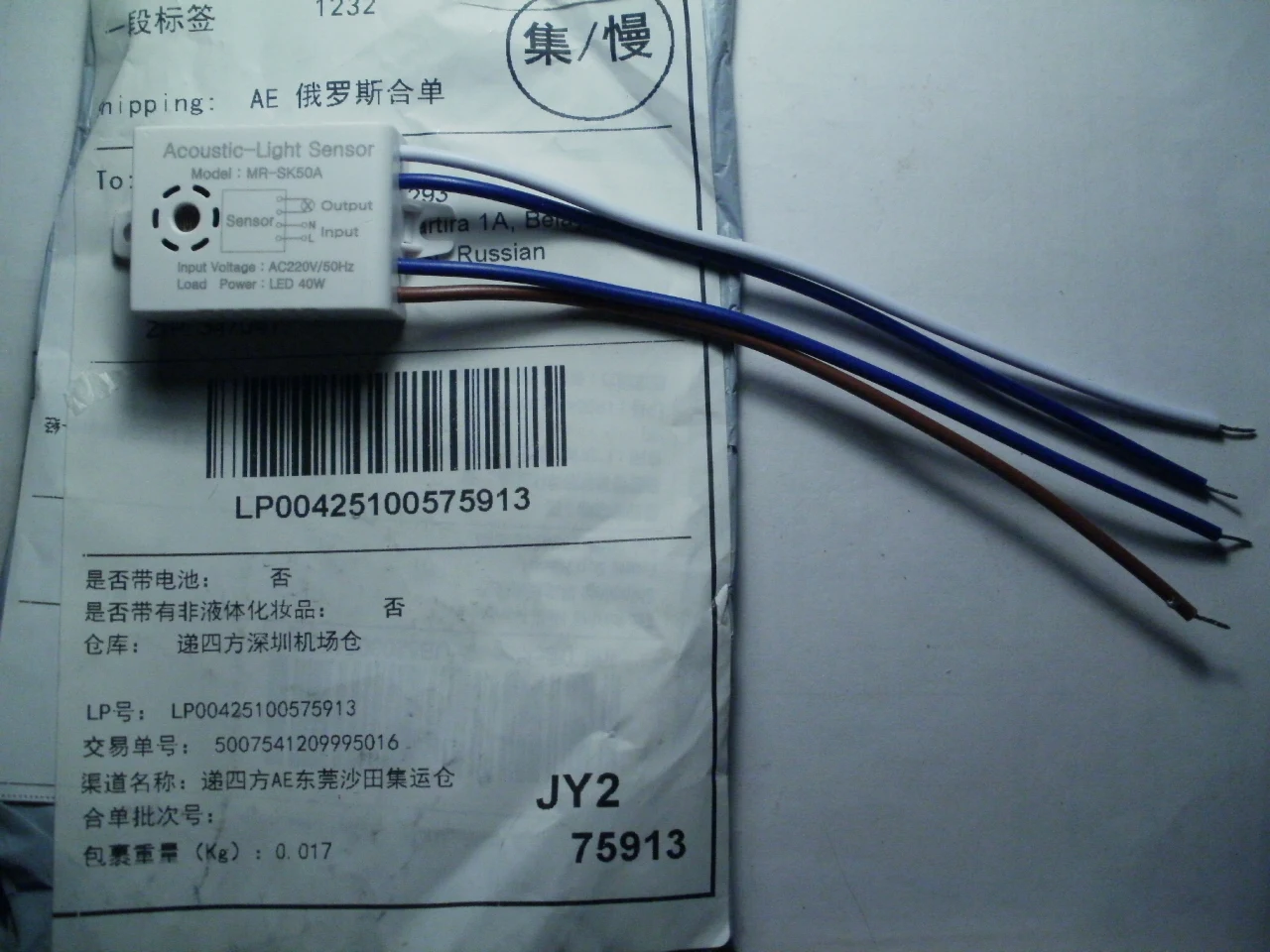 доставка не отслеживалась, пришло в срок. датчик размером меньше спичечного коробка, в светлое время на звук не реагирует, только в сумерках и темноте, есть датчик освещенности, реле включается от резкого звука на 50 секунд. считаю товар достаточно качественным.