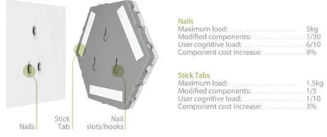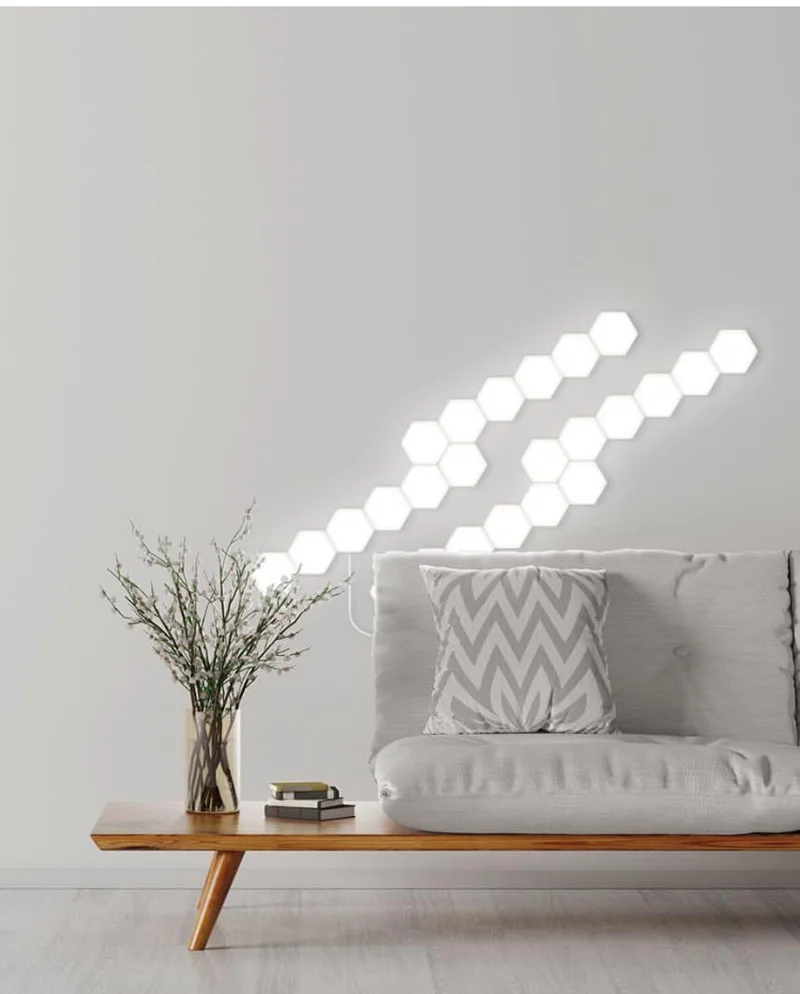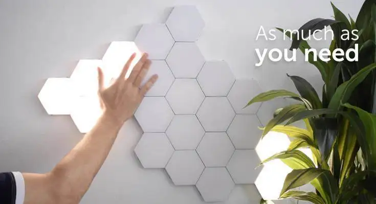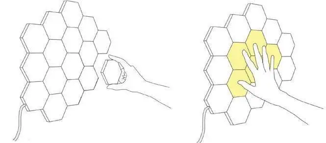 -Изделие состоит из нескольких пластиковых шестиугольников, которые можно соединить магнитами и блокирующимися узорами, образуя настенный светильник с сенсорным экраном. Магниты, составляющие физическое соединение между компонентами, также позволяют подавать ток из одного в другой. -Благодаря источнику питания устройства каждый компонент включается и выключается емкостным сенсорным датчиком. Основная идея продукта состоит в том, чтобы позволить пользователям преобразовать внутреннюю архитектуру пространства в источник светильник. Это дает пользователю возможность осветить тропинку, которую они касаются, просто скользя по поверхности стены. Превратите внутреннее здание в холст и позвольте пользователю использовать руку как кисть.