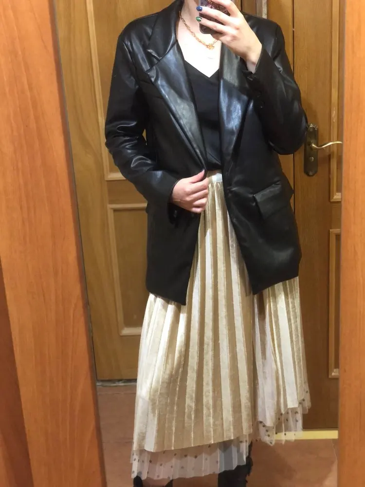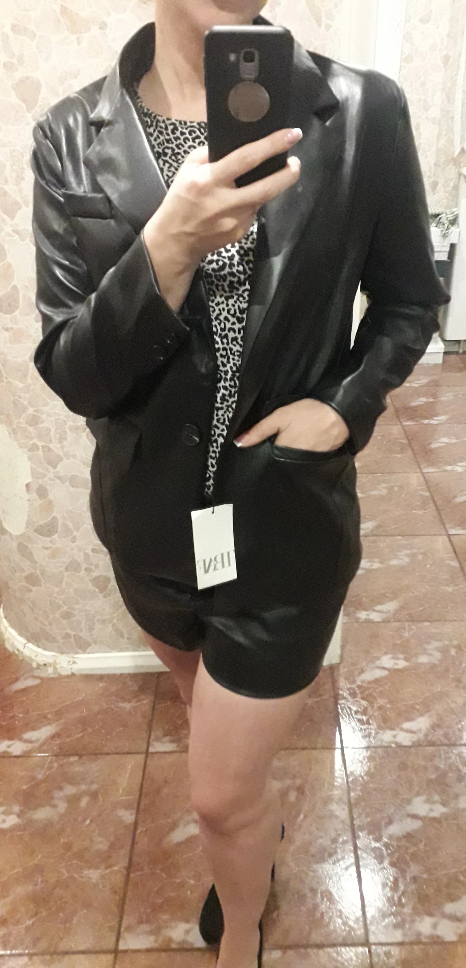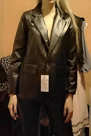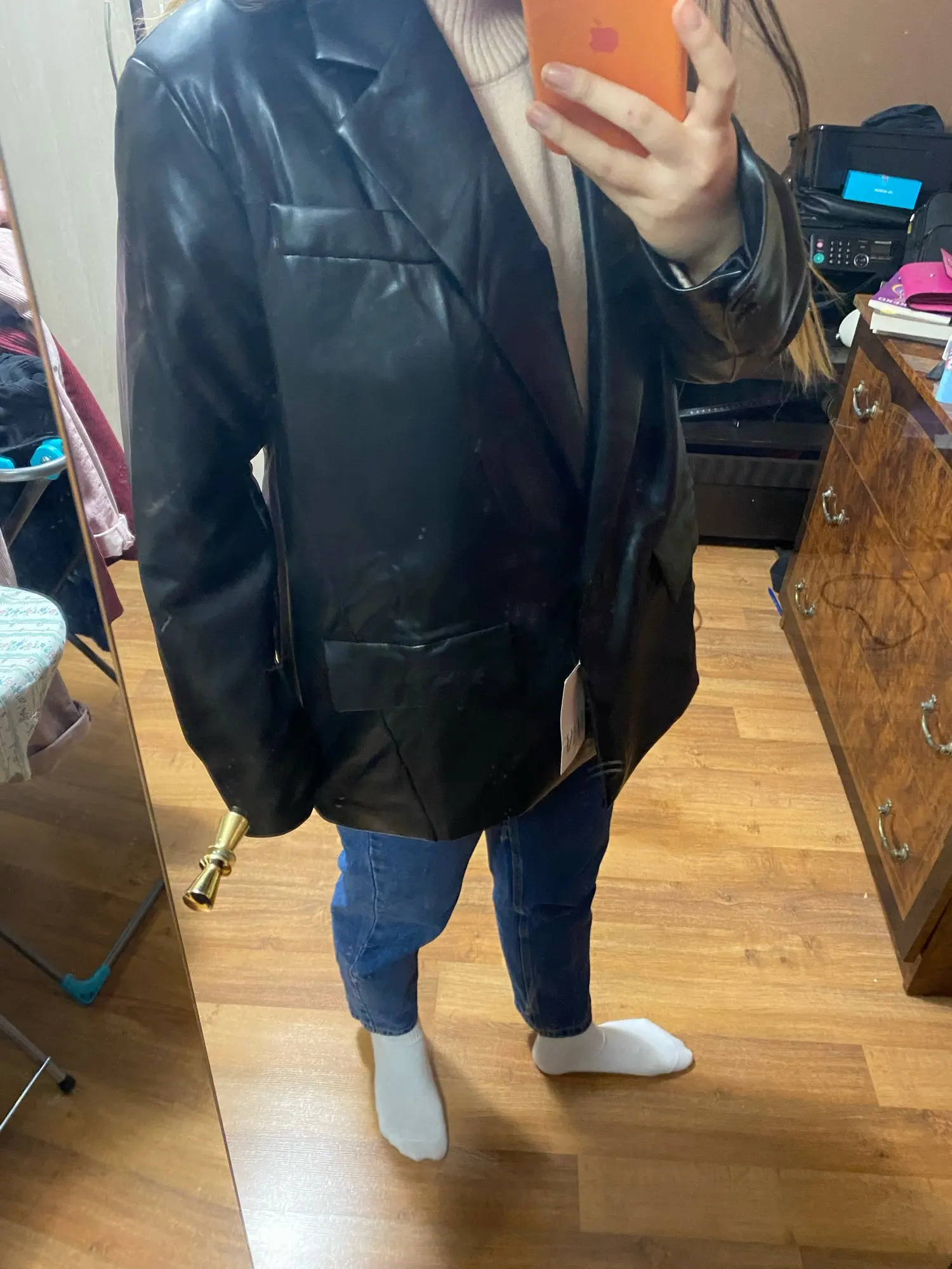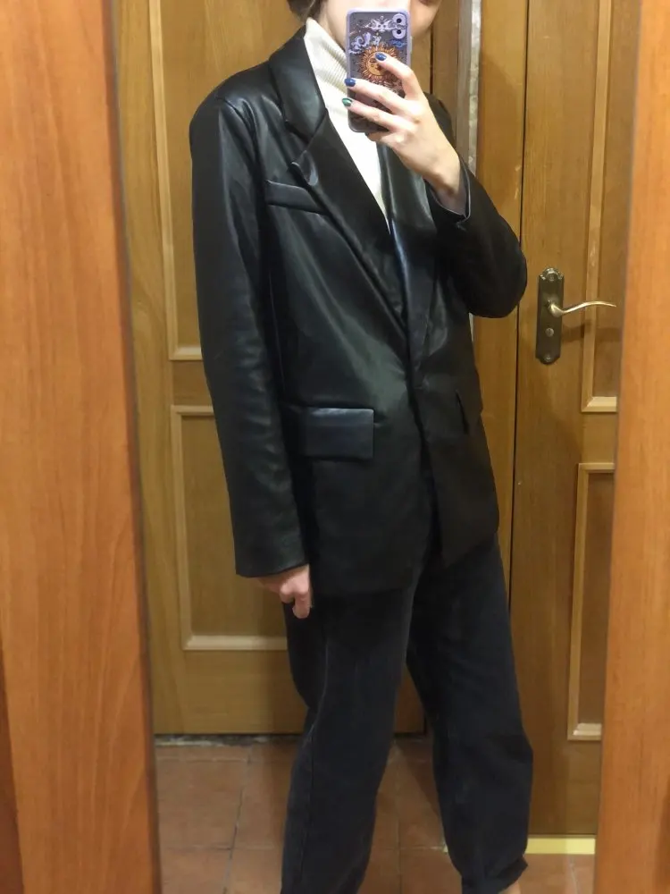 На параметры 83/63/92 размер XS сел слегка оверсайз, плечи у пиджака широкие. Имеет неприятный запах. По сравнению с зарой, у этого пиджака кожа больше блестит, не выглядит как натуральная. За эту цену сшит очень даже прилично. Есть подклад. Карманы настоящие. В нем жарковато, подойдёт как аналог кожаной куртки на весну. Доставка супер быстрая, до пункта выдачи.