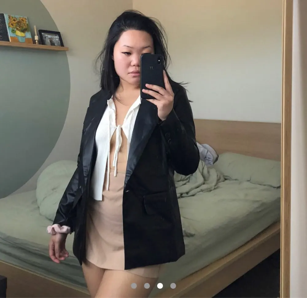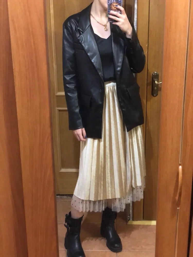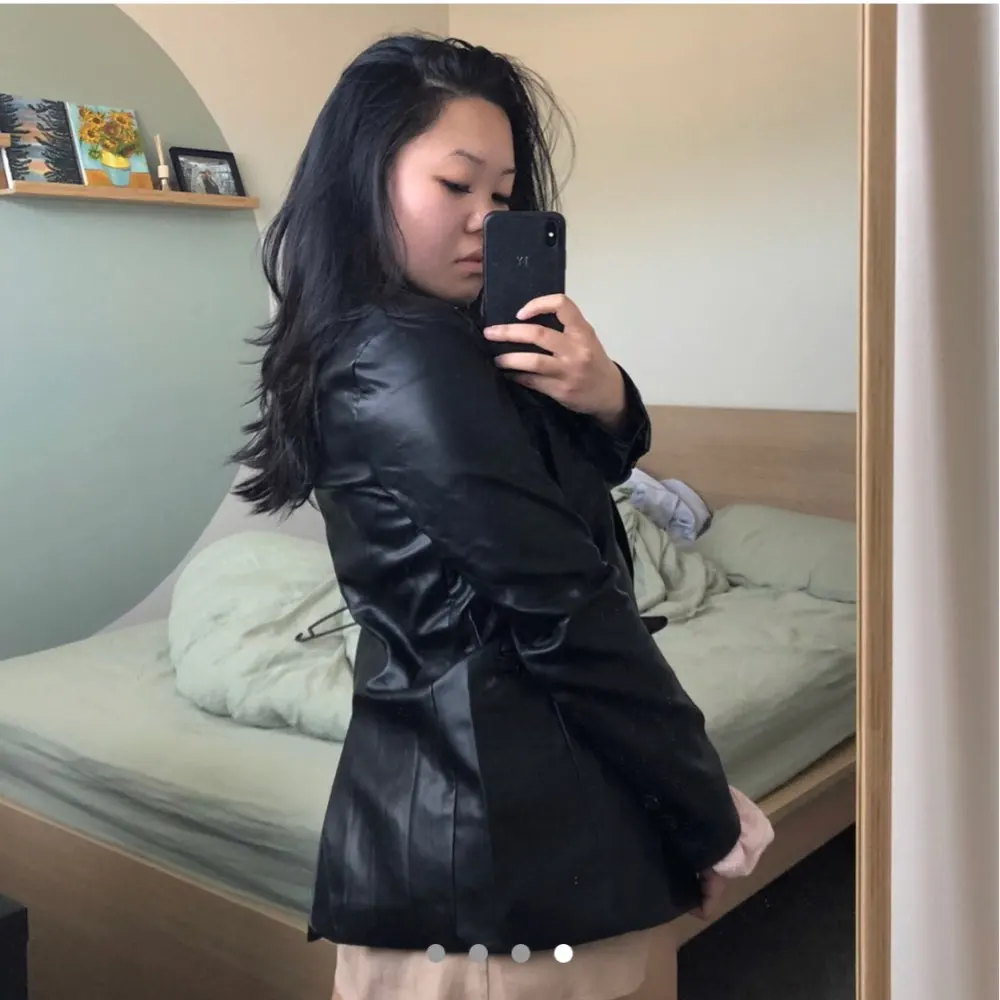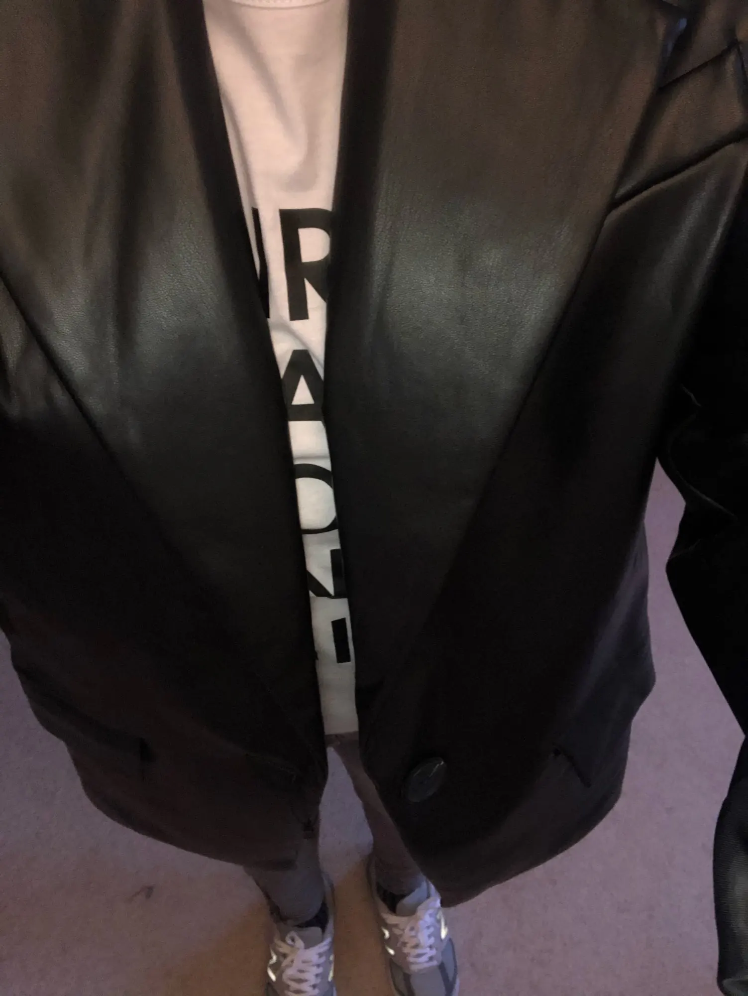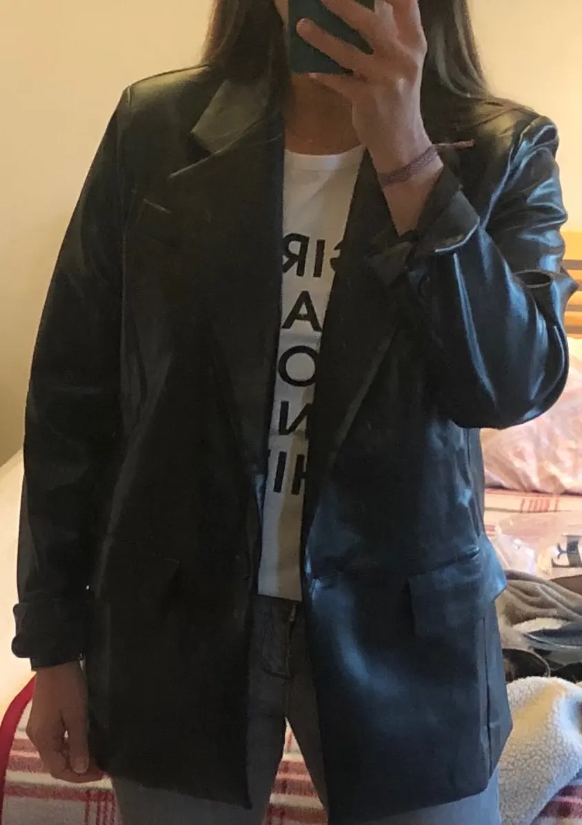 На параметры 83/63/92 размер XS сел слегка оверсайз, плечи у пиджака широкие. Имеет неприятный запах. По сравнению с зарой, у этого пиджака кожа больше блестит, не выглядит как натуральная. За эту цену сшит очень даже прилично. Есть подклад. Карманы настоящие. В нем жарковато, подойдёт как аналог кожаной куртки на весну. Доставка супер быстрая, до пункта выдачи.