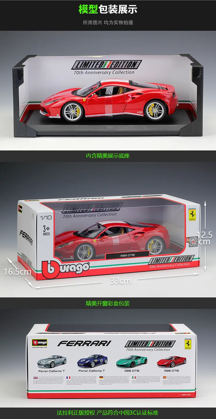 Модель автомобиля Bburago Ferrari 488GTB, модель автомобиля из сплава в подарок, игрушка, 1:18