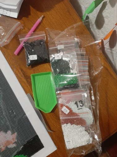 Посылка пришла быстро, очень удобно тем что каждый цвет уже в пакетике с замком и под номером, не то что у других. Минус где зеленый цвет на дереве там почему то синий, но я другой подобрала. Когда выложу скину