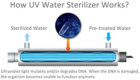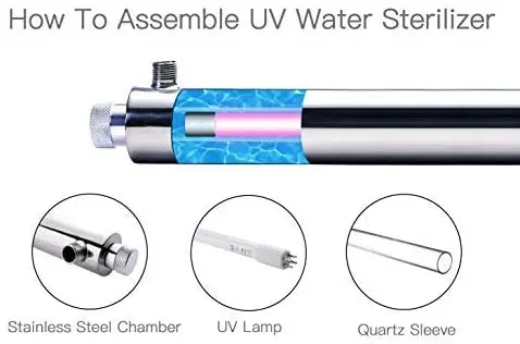 Стерилизация воды с использованием ультрафиолетового светильник с длиной волны 254нм-это химический свободный способ уничтожения крови микроорганизмов, которые не могут воспроизвести или вызвать инфекцию. Конструкция камеры потока использует энергию от ультрафиолетовой лампы равномерно через поток воды. Установка системы является прямой и простой. Техническое обслуживание включает в себя Изменение лампы один раз в год и периодически чистку кварцевого рукава.
