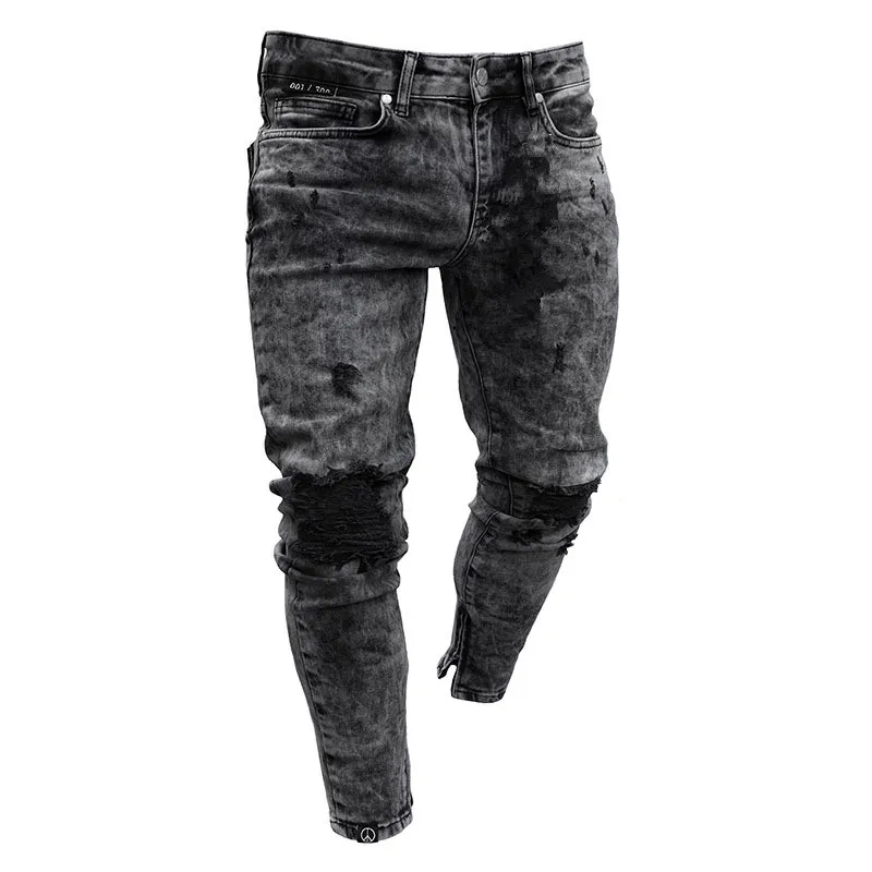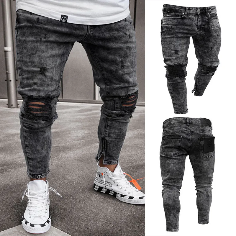 Новые мужские рваные джинсы, узкие брюки-карандаш в стиле хип-хоп, мужские Стрейчевые джинсы на молнии