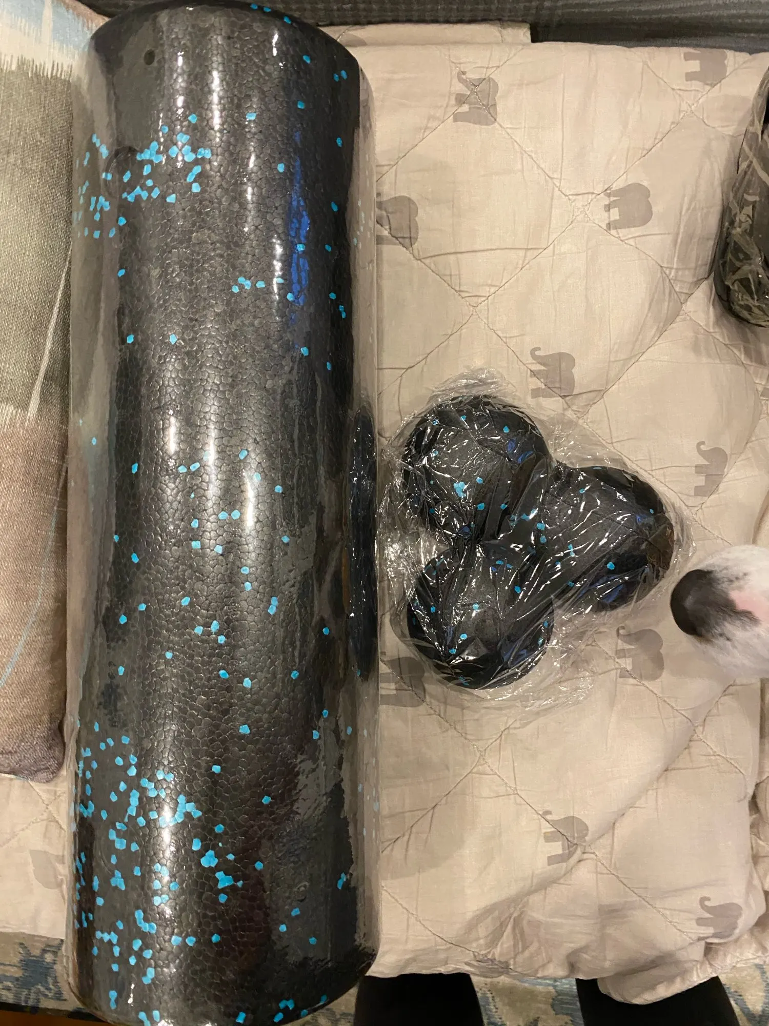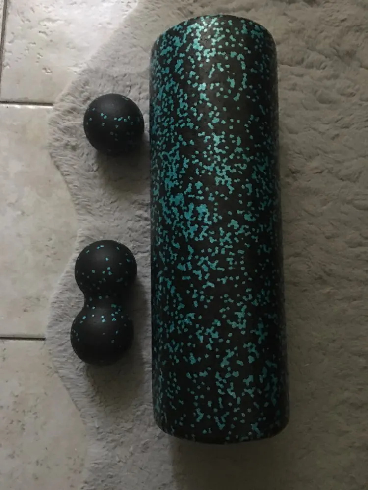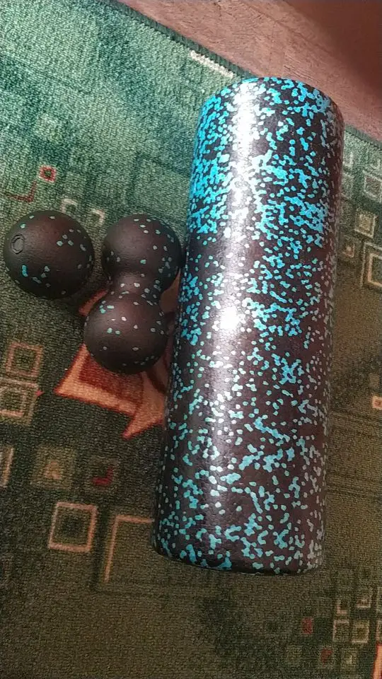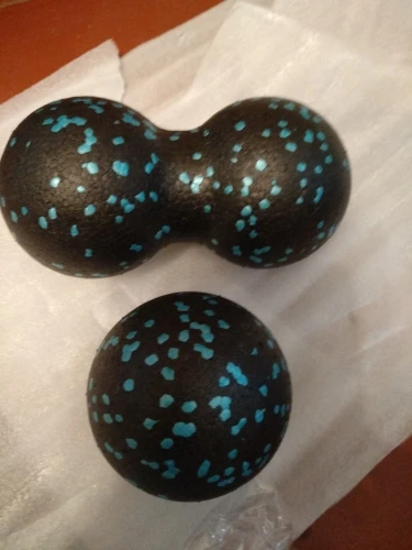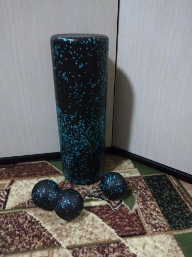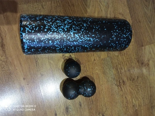 Ролл оптимального размера, охватывает все участки тела: удобно прокатывать спину, ноги, живот. Двойной мяч-арахис применим для занятий у стены: массаж воротниковой зоны и шеи. Заказ пришёл очень быстро - 14 дней. Покупкой довольна, рекомендую. Спасибо продавцу.