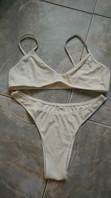 Очень странный лиф, тонкая ткань, не держится на месте при движении, немного различаются по размеру у меня. Красный как будто растянут, бежевый намного меньше, хотя все м. Трусики норм, не впивваются.в целом не взяла бы.