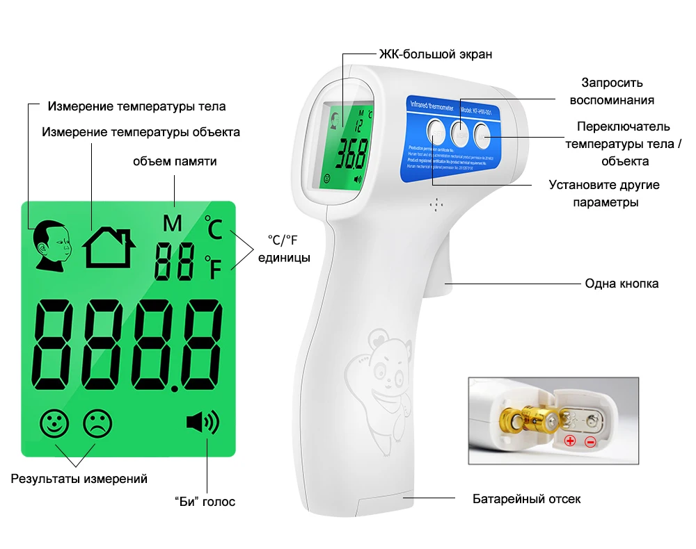 Отличный термометр. Полностью русифицирован. Пришел на почту за 16 дней. Как раз ребенок сегодня заболел, измерили тремя градусника и: ртутным, электронным и бесконтактным. Все показали 38.3. Можно ночью не будить ребенка теперь, чтобы узнать температуру. Спасибо огромное! Мерить нужно правильно, именно на переносице. Термометр взяли 11.11 по 749 рублей.