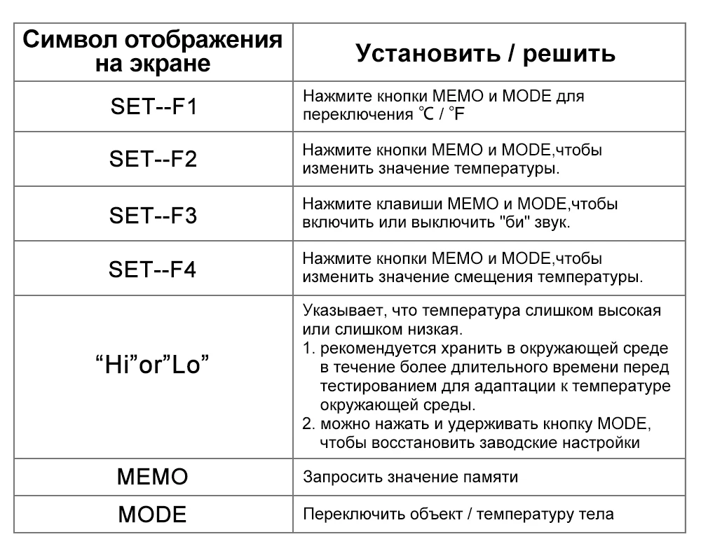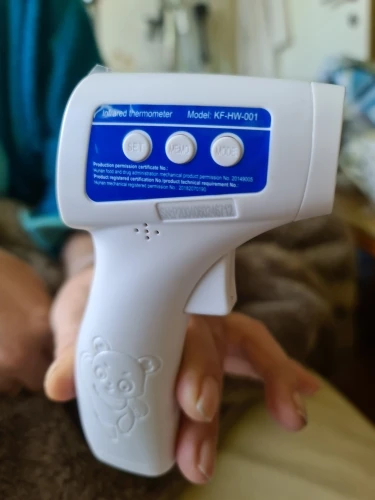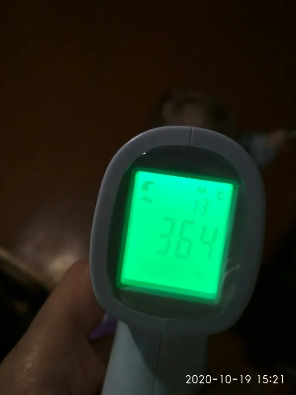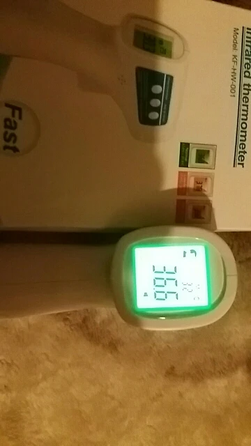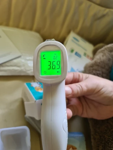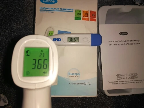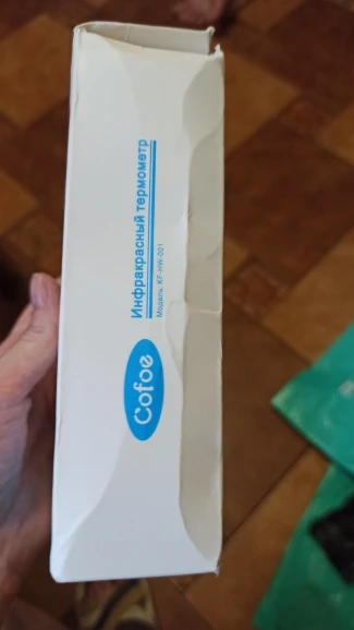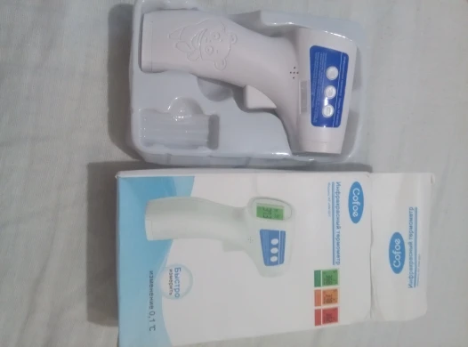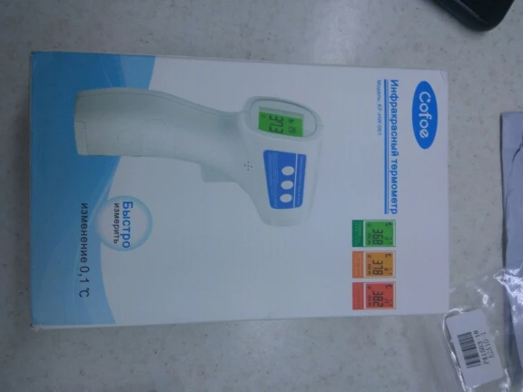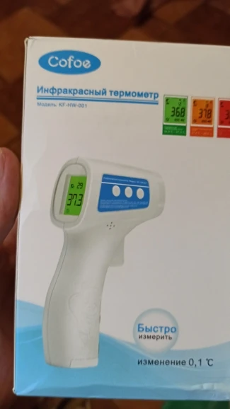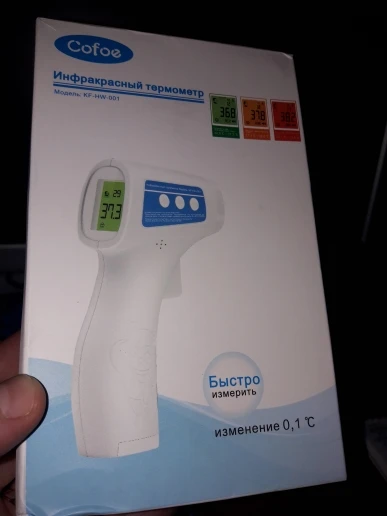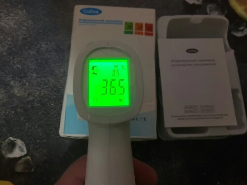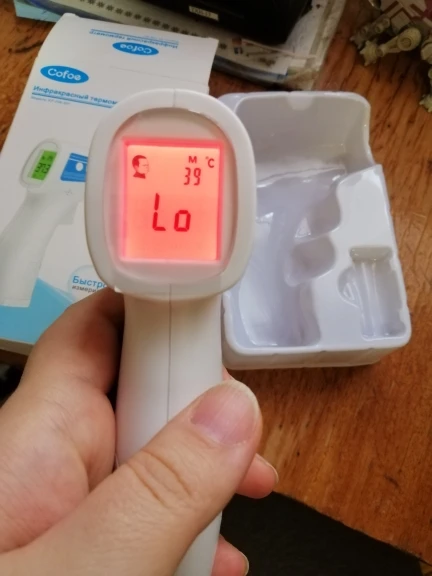 Термометр отримав у м"ятій коробці, але термометр працює. Посилка прийшла за 3 тиждні НП. Брали для вимірювання температури тіла. Міряє з допустимою похибкою. В інструкції написано міряти або на лобі або у вухах :) На руці відхилення температури 0,4 градуси. Налаштувати термометр можна, якщо потримати 3 секунди кнопку SET і потім ще три рази нажати на SET - перейти у 4 режим (F4), де будетемпература 0,0 та підкорегувати під ртутний термометр. Не лякайтесь, якщо при включенні у вас буде горіти червоне табло з високою температурою. Для усунення цього потрібно очистити пам"ять термометра, нажавши та потримавши 3 секунди кнопку MEMO.
