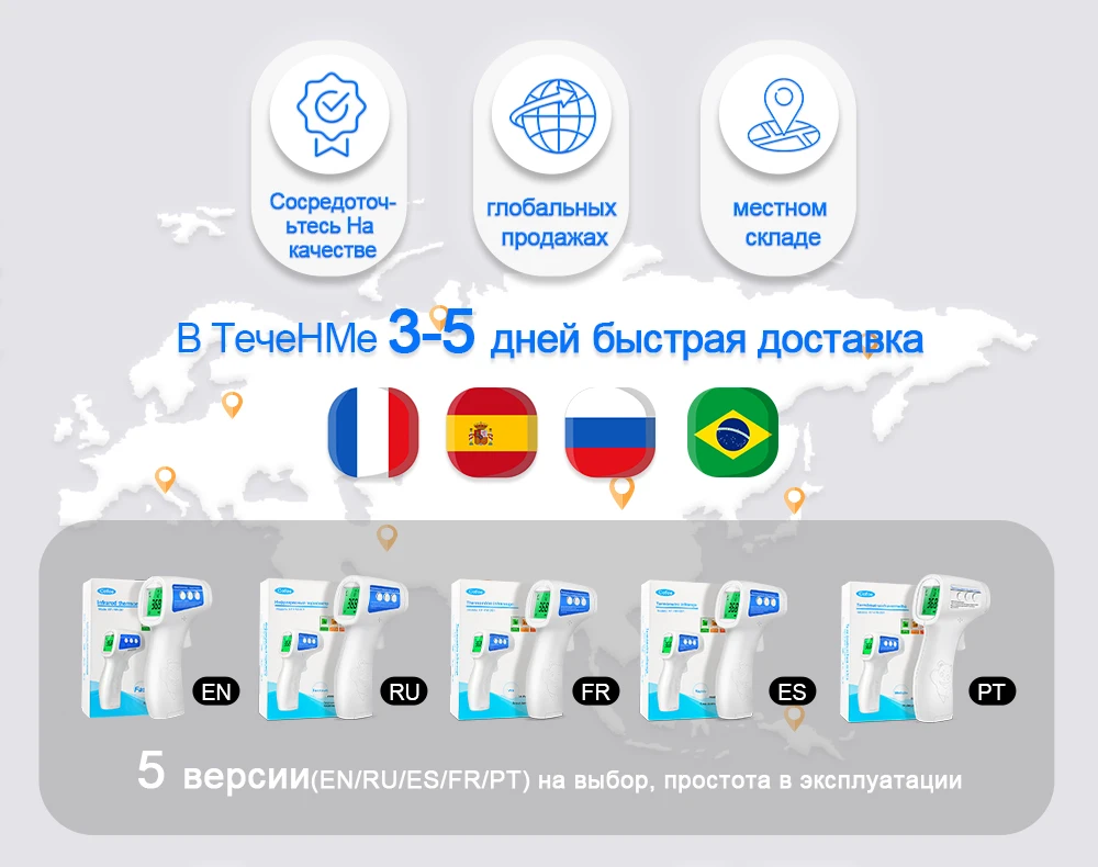 Термометр классный, измеряет температуру за 2 секунды. Показания точные. Сам термометр и инструкция на русском- в "русской версии" Теперь о доставке. В Беларусь заказывала из РФ, но оказалось, что доставки-то и нет. Даже если она формально есть у продавца. Пришлось ждать из китая, договорившись с продавцом. Беларусь, имейте это в виду и не тратьте деньги на доставку из РФ.