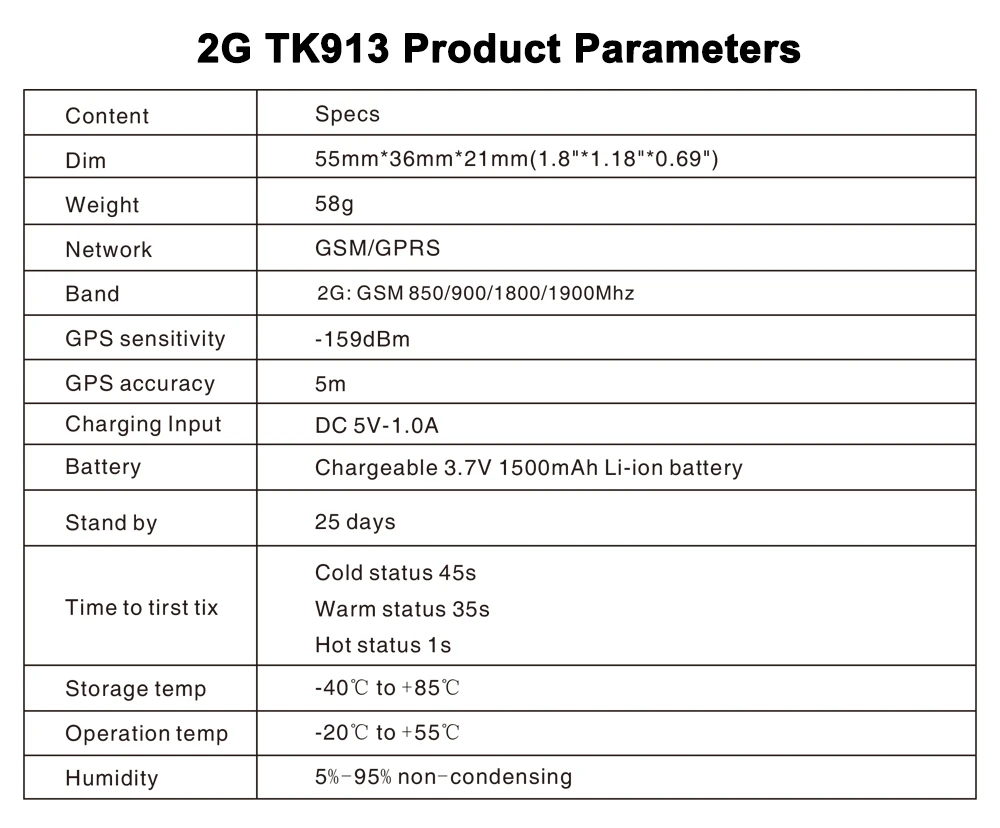 Этот мини-водонепроницаемый gps-трекер tkstar TK913-это 2g/GSM gps трекер, который работает на основе существующих сетей 2g GSM / GPRS и gps-спутников, он может находить и контролировать любые цели удаленно с помощью SMS, мобильного приложения и для отслеживания онлайн без каких-либо ограничений на расстояние отслеживания! Он принимает самые передовые технологии gps и LBS двойного позиционирования. Кроме того, со встроенным мощным магнитом, он может быть установлен очень легко и плотно на автомобиле, грузовике и любой цели с металлическим интерфейсом. Кроме того, этот трекер AP913 является полнофункциональным gps-трекером, который предназначен для широкого спектра приложений для отслеживания транспортных средств. Поддерживается дополнительным жестким проводным автомобильным зарядным устройством, которое обеспечивает непрерывную внешнюю мощность. Встроенный gps-приемник обладает отличной чувствительностью и быстрым временем для первого исправления. Его четырехдиапазонная подсистема gprs / GSM поддерживает 850/900/1800/1900 МГц, что позволяет TK105A's проверить местоположение в режиме реального времени или периодически контролировать внутренний сервер и мобильные устройства по всему миру! Интеграция системы проста, так как для протокола gprs-link предоставляется полная документация. В протоколах Gprs-communication поддерживается широкий спектр сообщений, включая аварийные ситуации, пограничные переезды с гео-забором, низкий заряд батареи, ударную сигнализацию и запланированное положение gps.