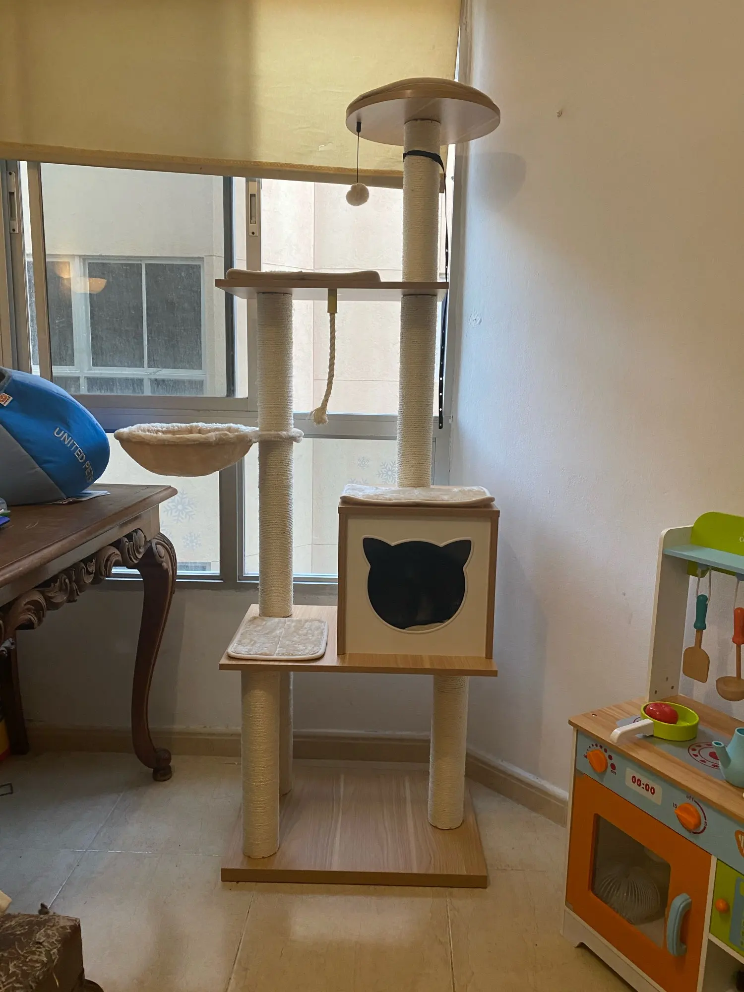 ·Универсальный комплекс отдыха и развлечений: несколько слоев предназначены для кошек, чтобы прыгать вверх и вниз, чтобы получить много упражнений. Кошки могут сразиться с висячим мячом, чтобы развлечь себя и приручить свои охотничьи навыки. По пути они прыгают вокруг кошачьего дерева, столбы, покрытые натуральным сизалем, позволяют им затачивать коготь. После того, как ваш энергичный котенок устанет, он может прокрасться в конюшню, чтобы поспать или вздремнуть на вершине окуня.