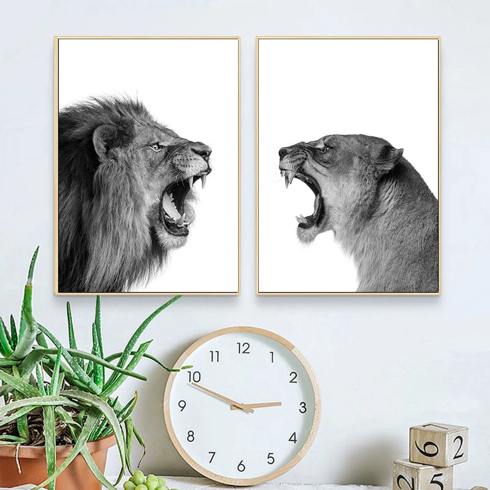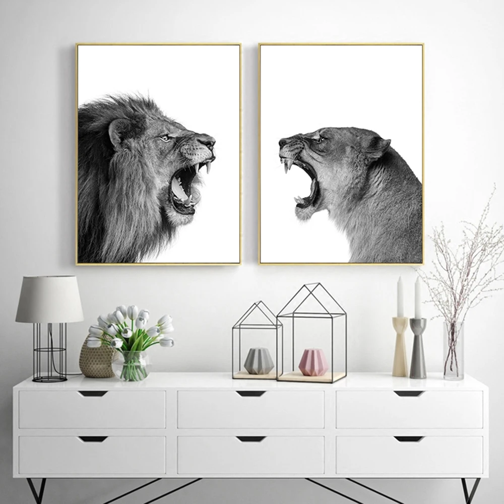 Холст с изображением Льва и львицы, постер с черно-белыми лесами, животные, настенная живопись, детская картина для гостиной, домашний декор