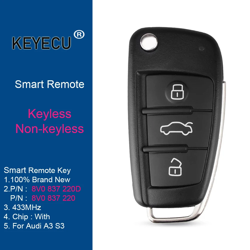 KEYECU 433 МГц PN: 8V0 837 220 D 8V0837220D 8V0837220 без ключа дистанционный ключ-брелок от машины для Audi A3 S3 2012 2013 2014 2015