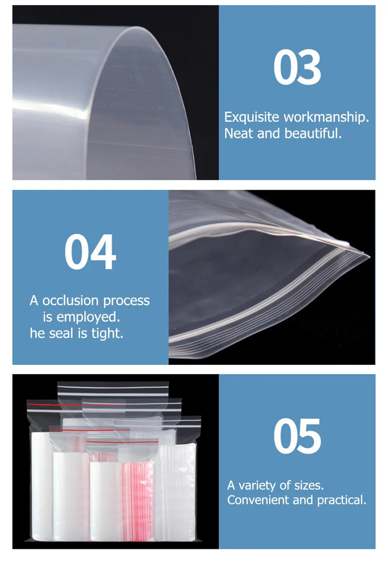 Материал: Полиэтиленовый пластикРазмеры: 4x6 см, 5x7 см, 6x8 см, 7x10,8x12 см, 9x13 см, 10x15 см, 11x16 см 12x17cm. Ошибка: 0-0,5 смТолщина:0,05 мм/0,06 мм/0,08 мм.Каждая сумка может быть повторно использована несколько раз.Отлично подходит для небольших деталей или принадлежностей для хранения.Он используется для упаковки продукта, хранения продуктов питания, ювелирных изделий, косметики, мелких деталей, инструкций, одежды. И так далееГерметизация проста и легка с одной полоской на молнии.Обратите внимание1. Для большего размера, просьа связаться в службу поддержки клиентов, мы предлагаем изготовление размеров под заказ, хорошее качество и доступная цена.2.4x6-14x20 см (карманный длина:1 ~ 1,5 см)15x20-35x45cm (карманный длина:1,5-2 см из-за)