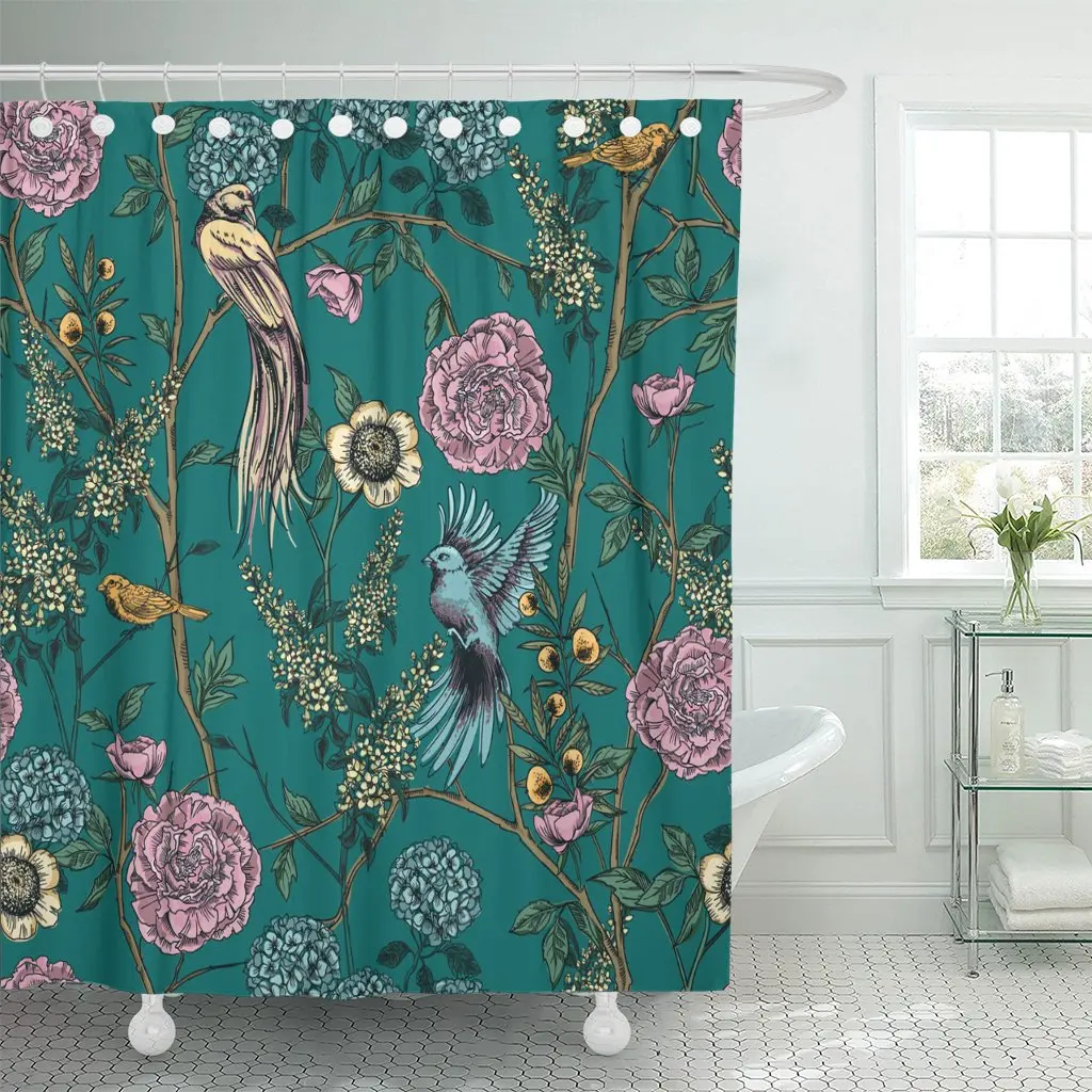 Занавеска для душа с цветочным узором в винтажном стиле, листья и т...