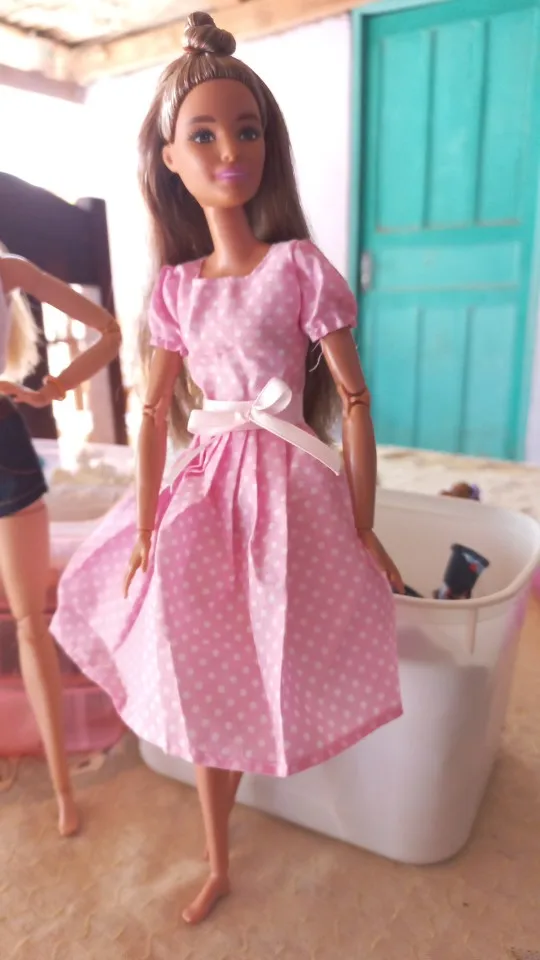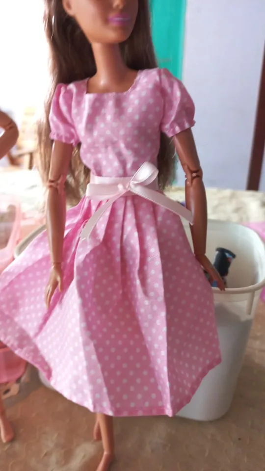 Платье на мой взгляд вовсе не платье.Пояс очень маленький и не держит платье по фигуре куклы.Сшито на 4.Материал хороший,жаль,из него можно было сшить,что-то более красивое.