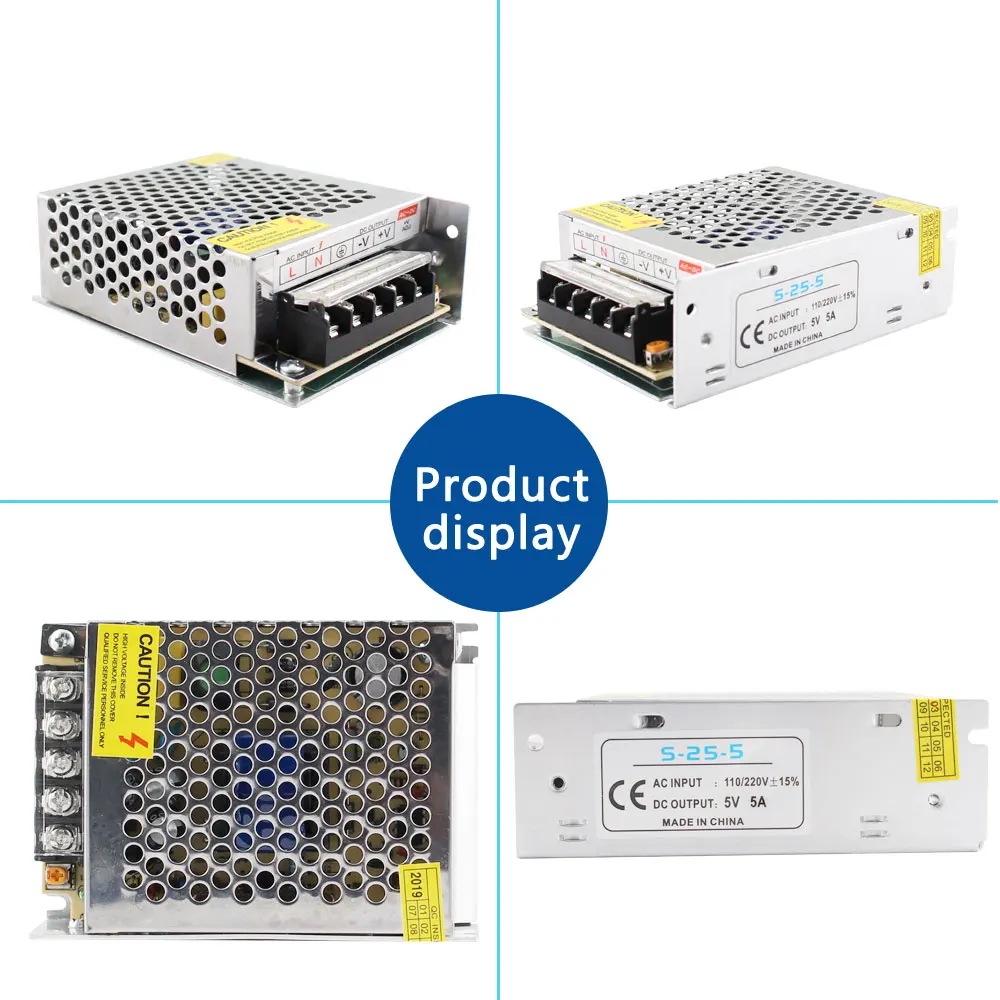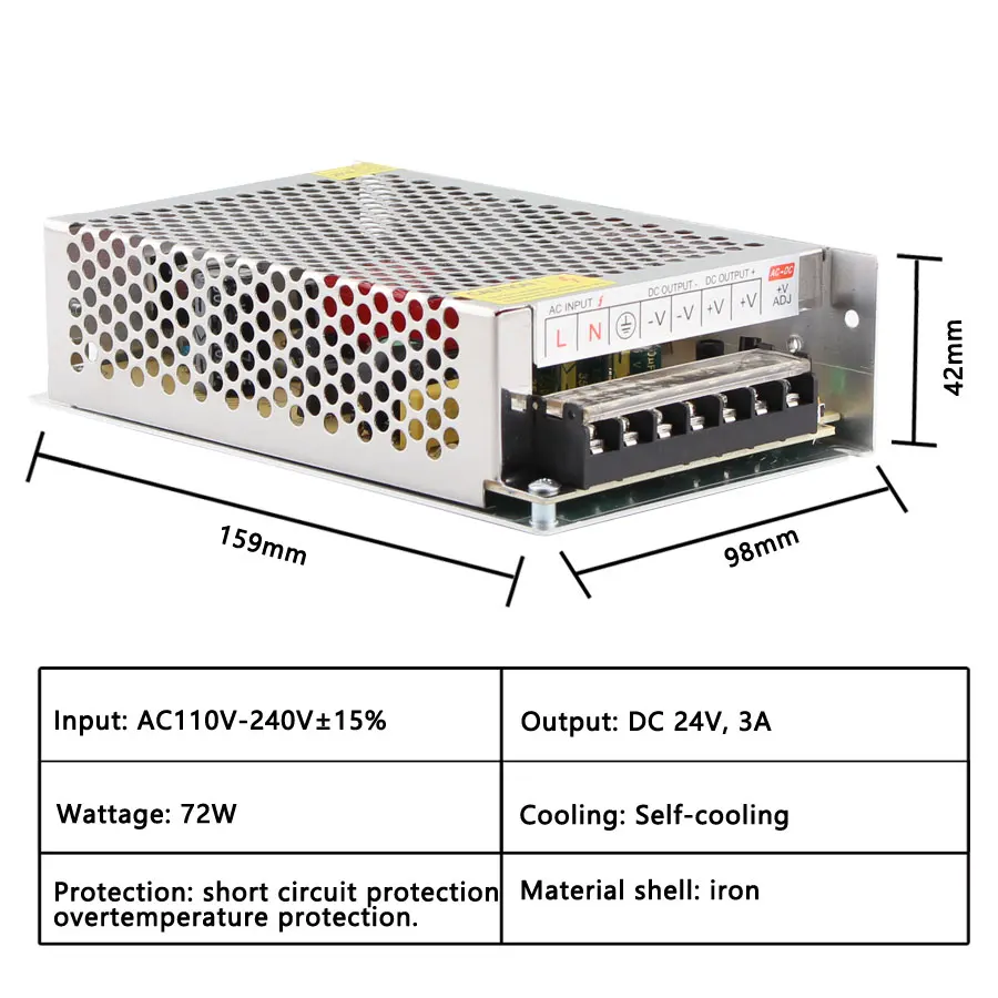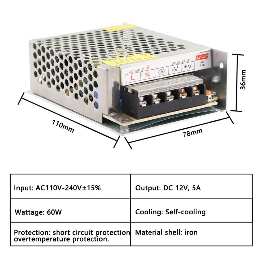 Описание товараВход Напряжение: AC110V/240VВыходное напряжение: DC 5 В/DC12V/DC24V /DC36VВыходной ток: 0 ~ 60AМатериал корпуса: металлический чехол/Алюминиевый чехолСоответствие безопасности: CCC / Rohs /CEВысокая цена-эффективная, надежность с промышленными стандартамиВстроенная защита от перенапряжения, перегрузки по току и короткого замыканияРабочая температура: 0 ~ 40CТемпература хранения: -20 ~ 60CВлажность окружающей среды: 0 ~ 95% без конденсацииТолько в дверях!Посылка включает:1 шт. источник питанияТип (выход)Размер (ДхШхВ)Intput напряжение (AC)12V 1A 12W 70mm * 40mm * 30mm 85V-265V12V 2A 24W85 мм * 57 мм * 33 мм85 В-265 в12V 3A 36W85 мм * 58 мм * 38 мм85 В-265 в12V 5A 60 Вт110 мм * 78 мм * 36 мм85 В-265 в12V 8A 96W160 мм * 98 мм * 42 мм85 В-265 в12V 10A 120W162 мм * 98 мм * 44 мм85 В-265 в12V 12.5A 150W 198 мм * 98 мм * 43 мм 85V-265V12V 15A 180W198 мм * 98 мм * 43 мм85 В-265 в12V 20A 240W200 мм * 100 мм * 44 мм110V/220V/15%12V 30A 360W200 мм * 100 мм * 45 мм110V/220V/15%12V 40A 480W215 мм * 115 мм * 50 мм110V/220V/15%12V 50A 600W242 мм * 124 мм * 65 мм110V/220V/15%12V 60A 720 Вт 245 мм * 125 мм * 68 мм 110V/220V/15%24V 1A 24W 85mm * 57mm * 33mm 85V-265V24V 2A 50W110 мм * 78 мм * 35 мм85 В-265 в24V 3A 72W110 мм * 78 мм * 35 мм85 В-265 в24V 5A 120W158 мм * 98 мм * 40 мм85 В-265 в24V 10A 240W198 мм * 98 мм * 40 мм85 В-265 в24V 15A 360W198 мм * 110 мм * 50 мм110V/220V/15%24V 20A 480W198 мм * 110 мм * 50 мм110V/220V/15%24V 25A 600W215 мм * 115 мм * 50 мм110V/220V/15%24V 30A 720W215 мм * 115 мм * 50 мм110V/220V/15%24V 33A 792 Вт 242 мм * 124 мм * 65 мм 110V/220V/15%5V 2A 10W 70mm * 40mm * 30mm 85V-265V5 в 6A 40 Вт 85 мм * 57 мм * 33 мм 85 В-265 в5V 10A 50W 110mm * 78mm * 36mm 85V-265V5V 20A 50 Вт 199 мм * 98 мм * 42 мм 85V-265V5 в 30A 50 Вт 199 мм * 98 мм * 42 мм 85 В-265 в5V 40A 200 Вт 200 мм * 115 мм * 50 мм 85V-265V5V 60A 300 Вт 214 мм * 113 мм * 50 мм 85V-265V