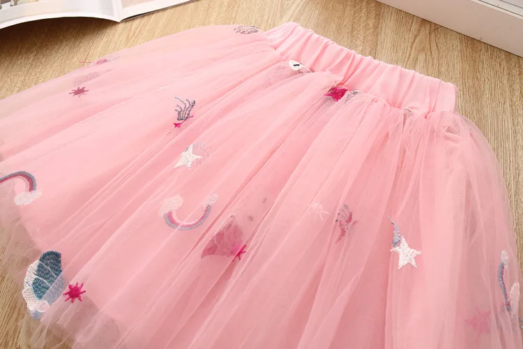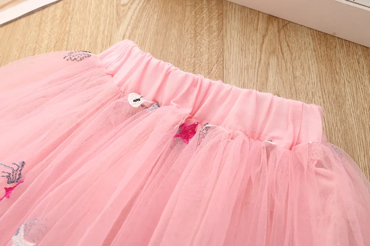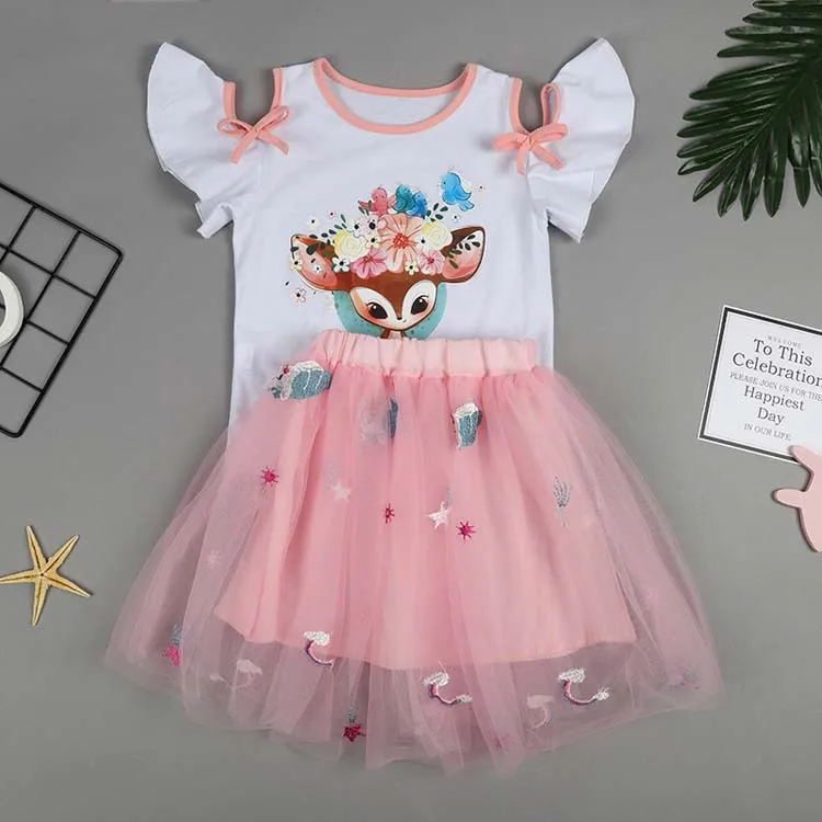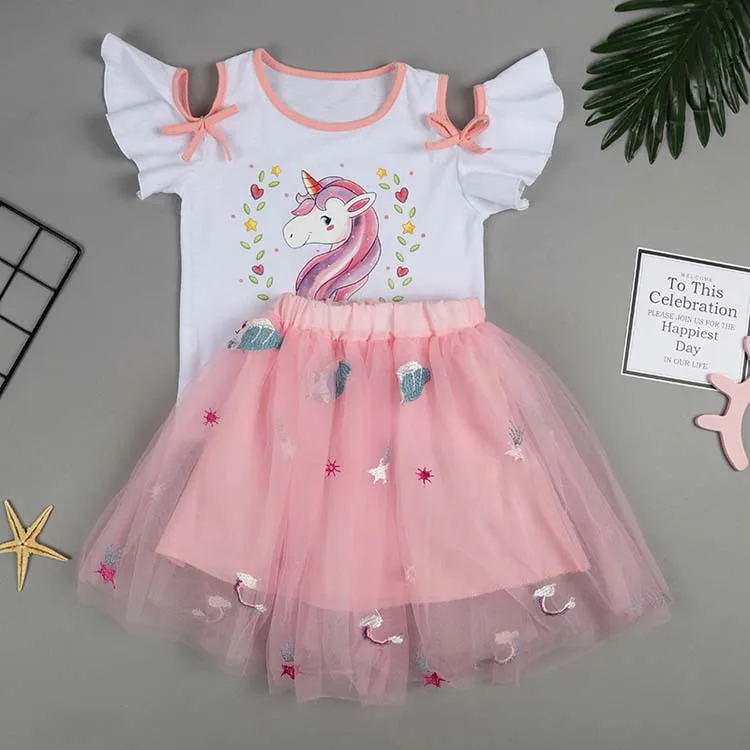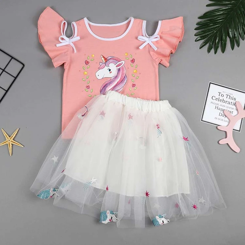 Комплекты одежды с принтом единорога для девочек, летний топ с расклешенным рукавом + сетчатая юбка, 2 шт., детская праздничная одежда для дня рождения, 2-7 лет
