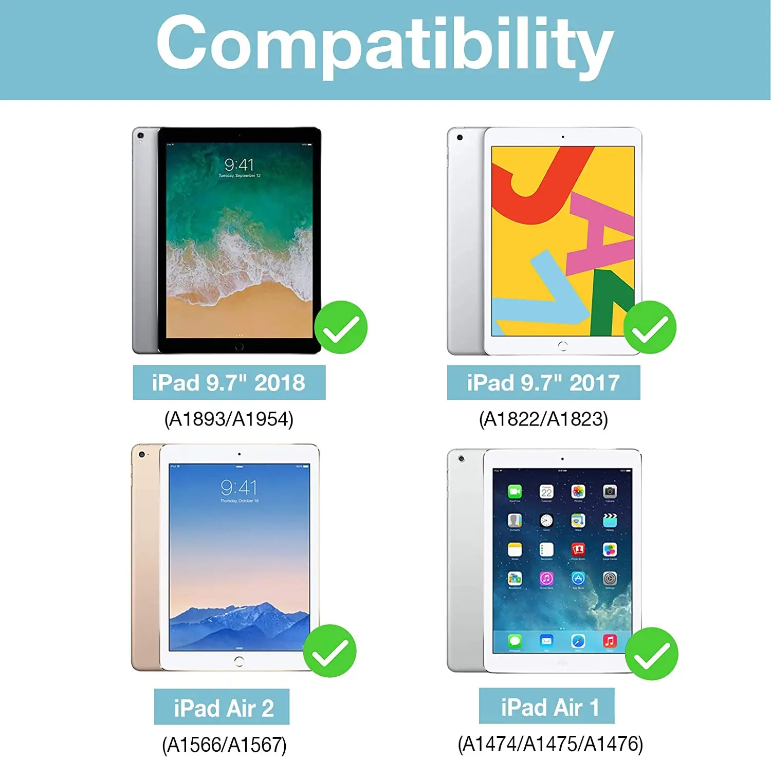 Характеристика продукта* 100% новые чехлы.* Прочный и моющийся.* Изготовлен из высококачественного материала.* Защитите от пыли, царапин и ударов* Модный дизайн, легко надевается и легко снимается* Умный чехол, близкий к сну, открытый для пробуждения.Защитный чехол для планшета подходит дляIPad Air 1 (номер модели:A1474/A1475/A1476)/IPad Air 2 (номер модели: A1566/A1567)/Для iPad 9,7 дюймов 2018 6-го поколения (номер модели: A1893/A1954)/для iPad 9,7 дюймов 2017 5-го поколения (номер модели: a1822/A1823) не совместим с другими моделями планшетов
