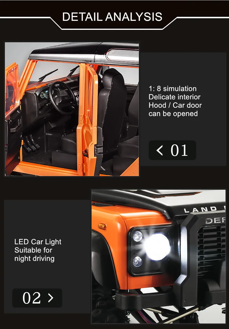 Название продукта: Landrover DefenderСоотношение товара: 1: 8Цвет изделия: оранжевый/зеленыйРазмер изделия: 64x28x31 см (1 дюйм ≈ 2,4 см)Посылка Размеры: 67x30x38 см (1 дюйм ≈ 2,4 см)Частота сигнала удаленного устройства: 2,4 ГГцСкорость движения: > 20 км/чУдаленное Расстояние: > 80 мСрок службы: ≥ 20 минутВремя зарядки: 250 минутЕмкость аккумулятора: 7,4 в 3000 мАчАккумулятор пульта дистанционного управления: 1,5 V "AA" x4 (к товару не прилагаются)Материал изделия: сплав, пластик, резина, электронные компонентыОсобенности продукта:1. Подлинная Land Rover Defender Авторизованная, 1: 8 масштабная модель автомобиля;2, 1: 8 моделей моделирования дизайна и конфигурации освещения, тщательно резное производство;3. Капот, дверь и дверь багажника могут быть открыты вручную; Запасные шины могут быть заменены и использованы;4. Металлические модельные балки, оси, высокопрочные шасси, большие горные шины, адаптируются к различным дорожным условиям;5. Мощный двигатель, с полным соотношением руля сервопривода и руля триммера, эффективно оказывает сильную силу скалолазания;6. Регулируемая скорость, реализуется функция переключения высокой и низкой скорости, имитирует функцию переключения Передач L / S;7. Интегральная система, супер водонепроницаемая производительность;8. Рамка может быть изменена, чтобы обеспечить удобство модификации для любителей моделей;9. 2,4 ГГц дистанционный пульт, супер анти-помех, можете играть в нескольких автомобилей;10. Гидравлическая амортизация, рукав металлического вала, обновление структуры трансмиссионного стержня; Делает структуру более стабильной; В то же время, улучшает сотрудничество между двигателем и коробкой передач;Посылка включает в себя:1 x RC автомобиль1 пульт дистанционного управленияАккумулятор-1 шт.Зарядное устройство-1 шт.1 х Руководство