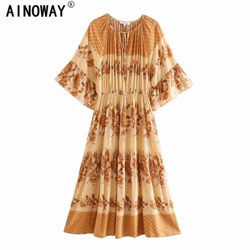 Женское винтажное богемное платье макси, длинное пляжное платье с цветочным принтом, рукавом летучая мышь, V-образным вырезом и бахромой в стиле бохо