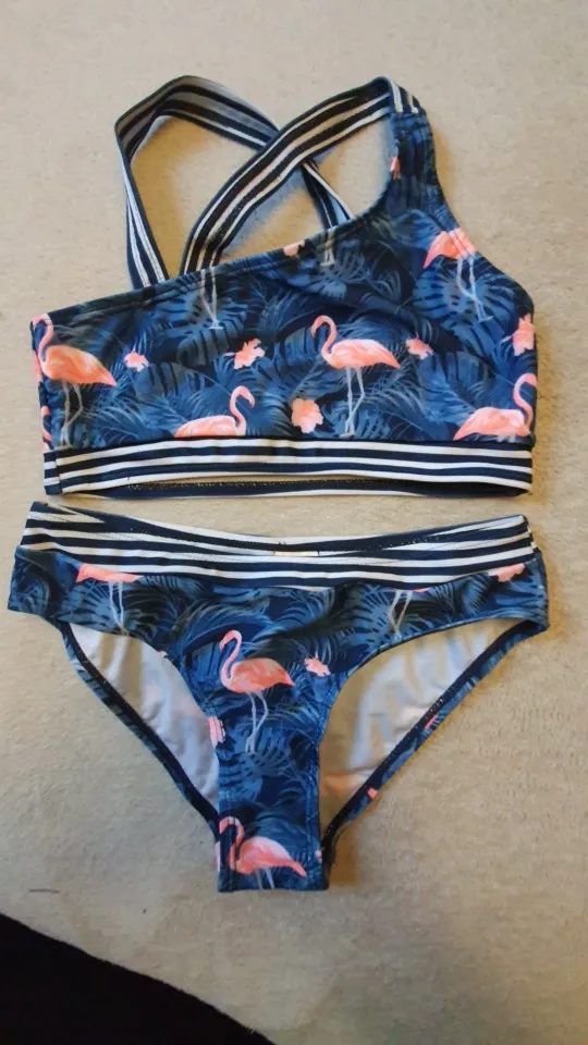 Купальники были точно такие же, как на картинке. Они входят в милую сумку с галстуком. Отличная покупка, соответствует размеру.