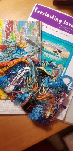 My cross stitch set came really fast and nicely wrapped up- no damages. All in place - instruction, Aida, needles and threads in lovely bright colours. Edges of Aida has been already fasten (no fray) and canva is clean ( no colour stain). Thread is not tangled, easy to separate and use. I am very happy from my choice I do recommend and I will keep you update. Thank you!