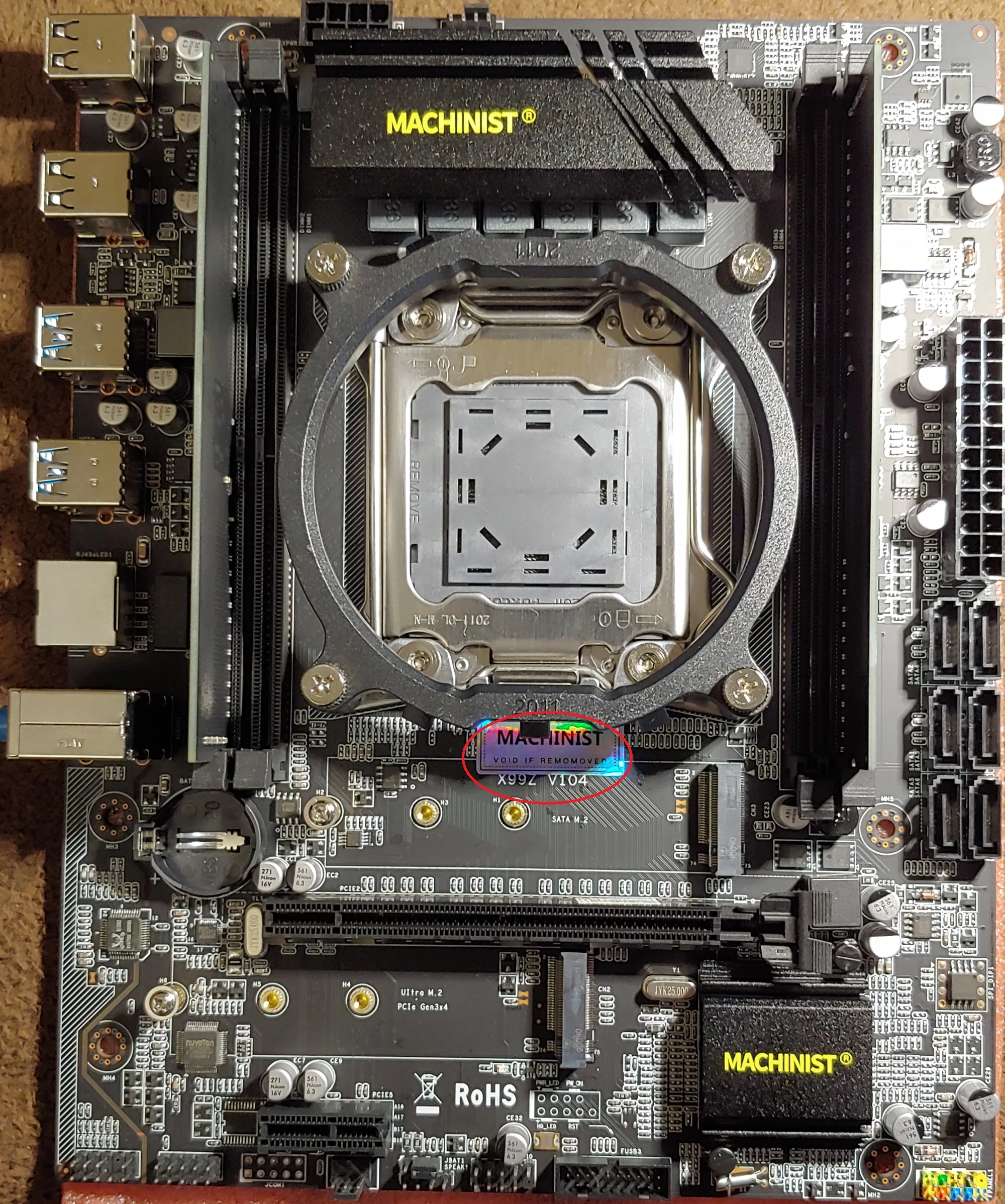 Быстрая доставка. Хорошая упаковка. И что круто - продавец прислал улучшенную версию материнской платы v102, которая сейчас называется v104 (смотрите на фото). Это та же материнка, но улучшен шим контроллер питания (теперь он как у Хуананов). И разъем питания процессора развернули на 180 градусов - будет удобнее отсоединять или присоединять.