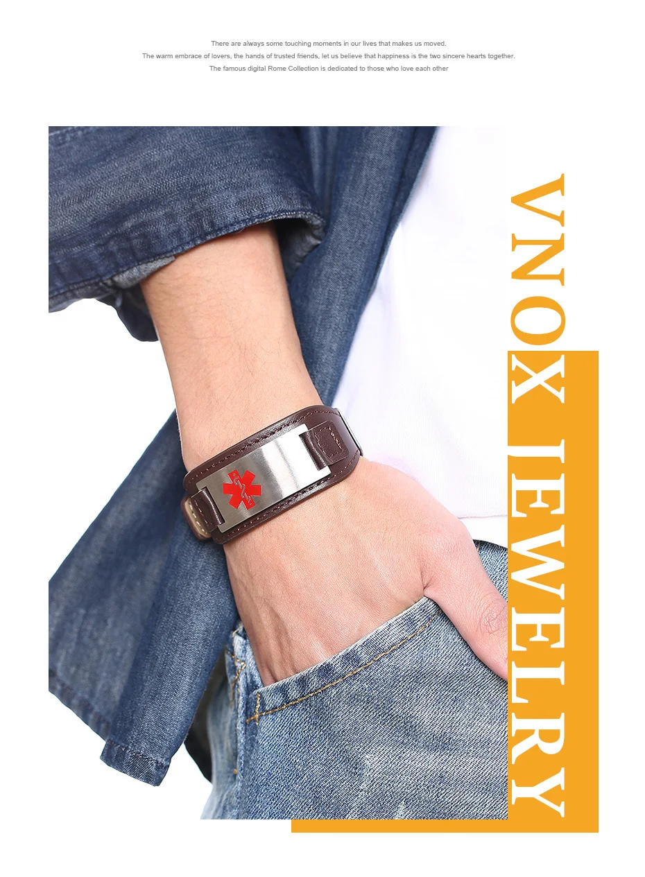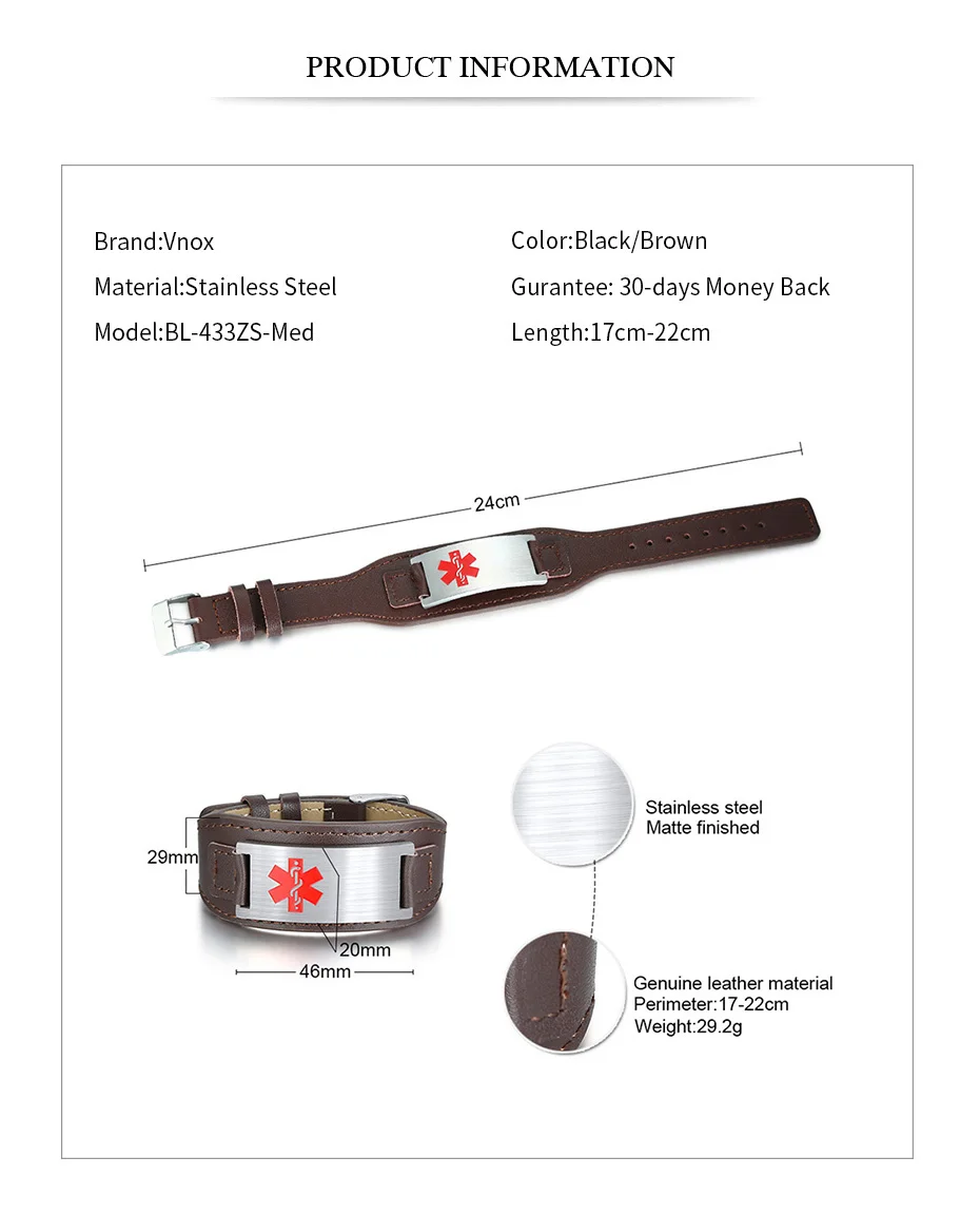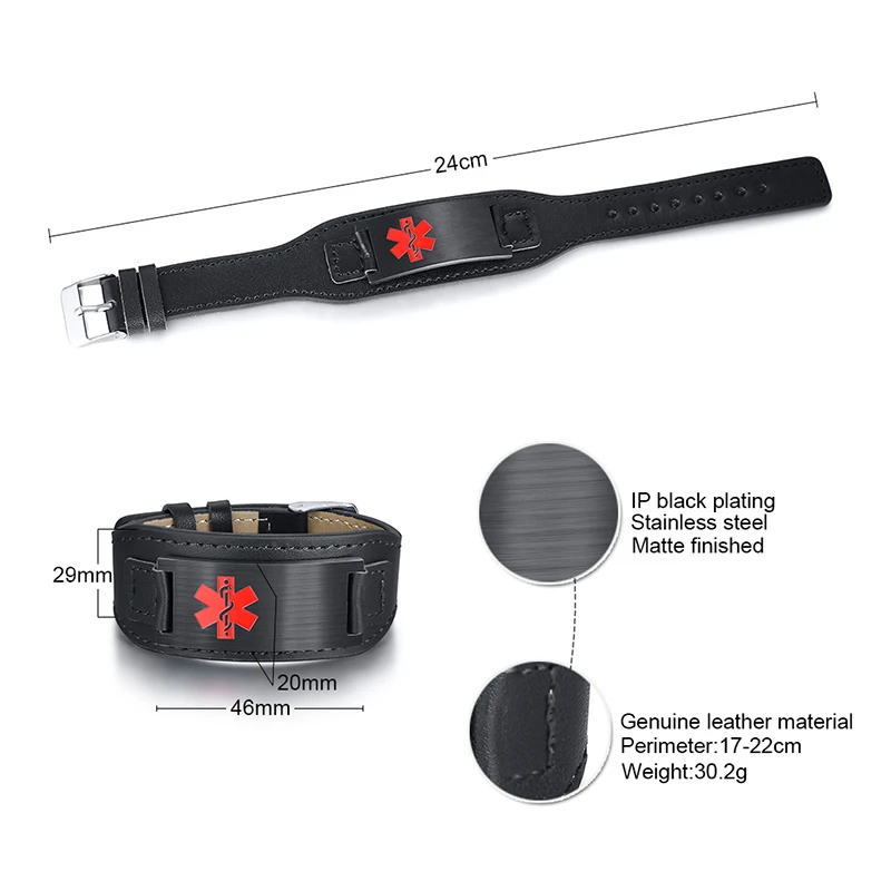 Почему носить Медицинский ID продукт:Ваше медицинское удостоверение личности обеспечивает быстрое признание ваших медицинских условий, аллергии, лекарств или пожеланий лечения; Это приводит к более быстрой и эффективной медицинской помощи.Медицинский ID браслет уменьшает ошибки лечения, которые могут возникнуть в результате отсутствия медицинской записи пациента во время чрезвычайной ситуации или при поступлении в госпитальМедицинский идентификатор говорит за вас в случае чрезвычайной ситуации, если вы не реагируетеМатериал из нержавеющей стали, не вызывает аллергии, не ржавеет, не содержит свинец, не содержит никельМедицинская идентификация ювелирных изделий может сэкономить жизни, предоставляя первой ответственной критической информации о здоровье в чрезвычайной ситуации. Ювелирные изделия Vnox имеют большой выбор медицинских ID ювелирных изделий для выбора.Общие причины ношения медицинской идентификации:(1) физическая аллергия, включая укусы насекомых, линзы, пищевые типы;(2) физические условия, включая сердечные состояния, судороги, обход желудка RNY;(3) медицинские аллергии, включая лекарственные средства, латекс, химикат;(4) медицинские условия, включая диабет, ITP, аутизм, альцгеймеры.Мы рекомендуем выгравировать:Ваше имя и фамилия