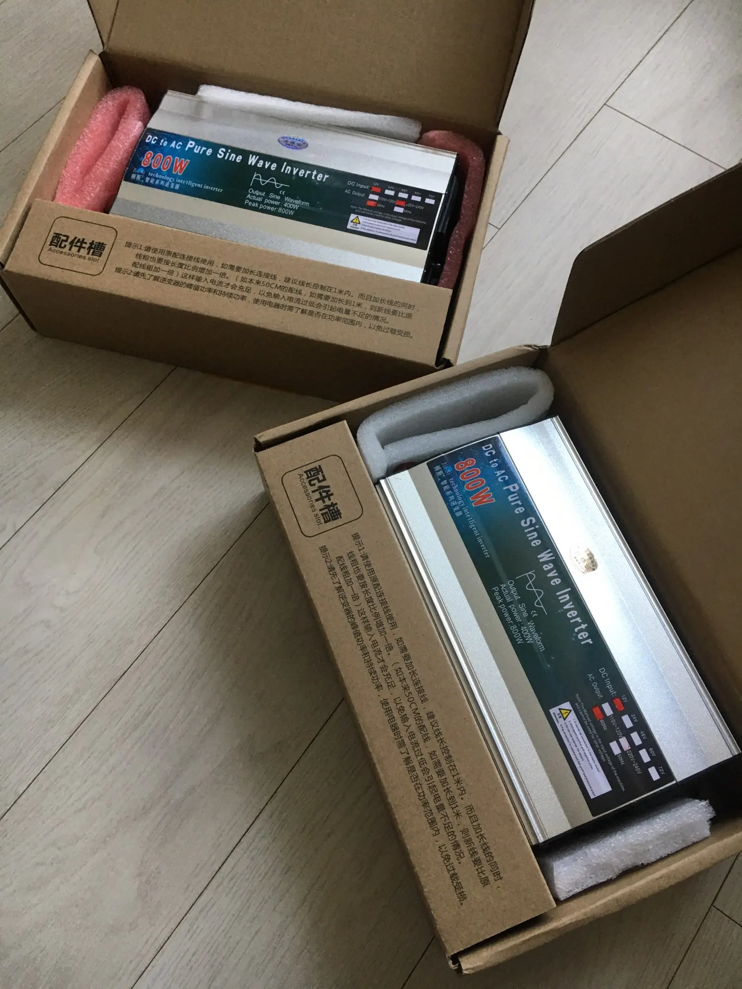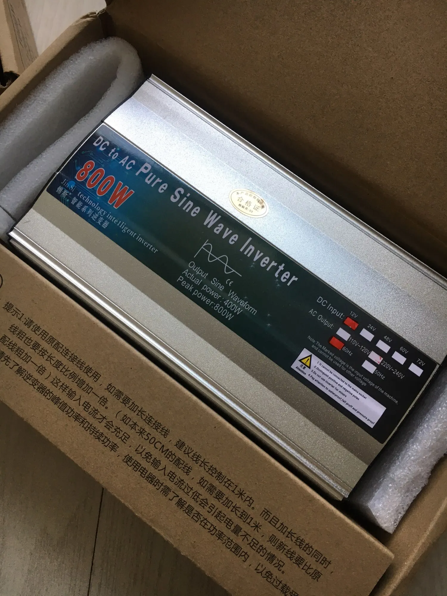 Инвертор приехал за 10 дней на Южный Урал. Брал на 800 ватт 12в для насоса отопления. На инверторе написано, что 800 ватт это пиковая мощность, 400 ватт максимальная (постоянная) нагрузка.
