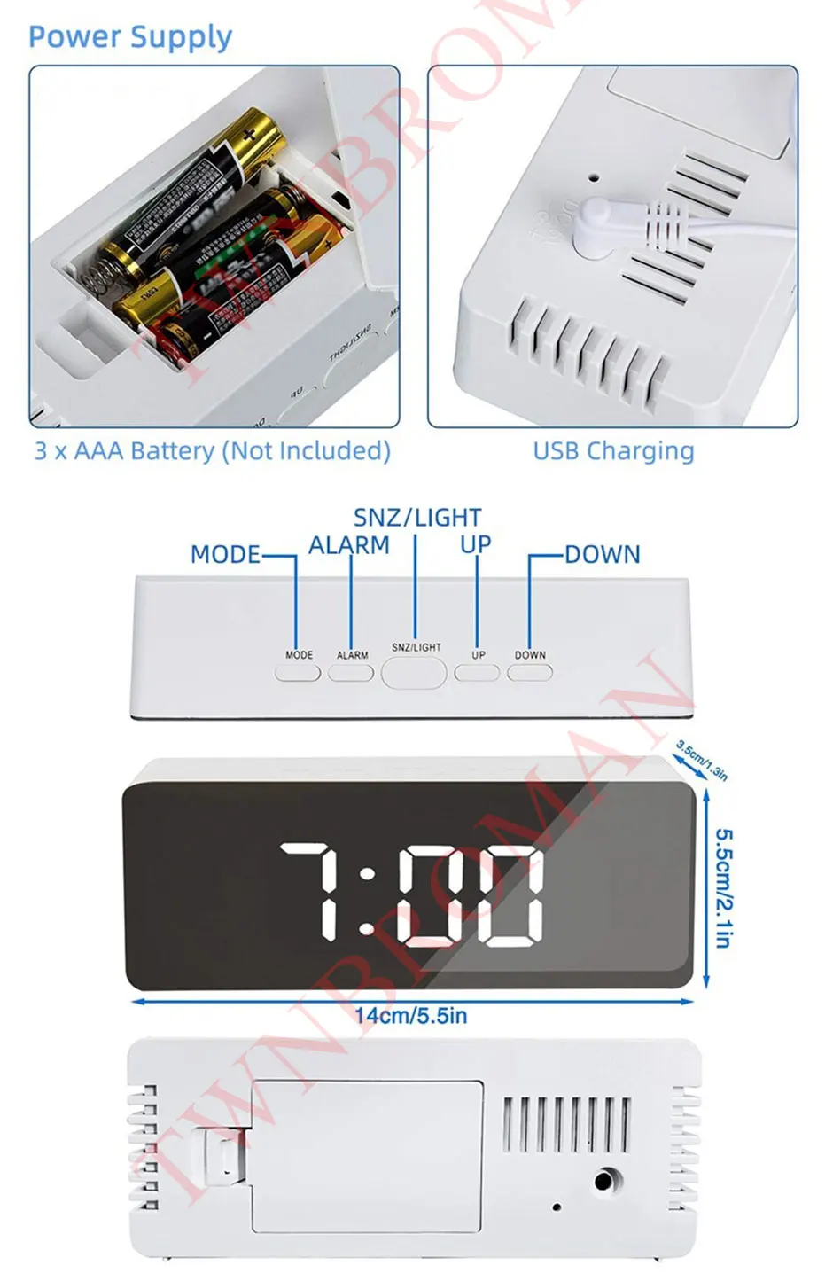 1. Пять функциональных кнопок (режим, будильник, SNZ/LIGHT, UP, DOWN)